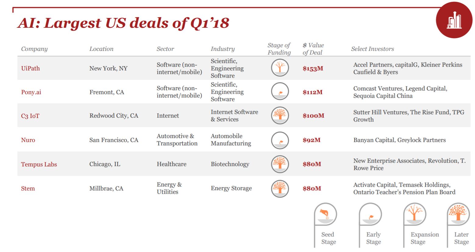 Realizatorii raportului MoneyTree afirmă faptul că primul trimestru din 2018 a fost unul record în ceea ce privește finanțarea obținută de startup-urile care dezvoltă produse pe baza inteligenței artificiale (AI). Acestea au primit peste 1,9 miliarde de dolari.