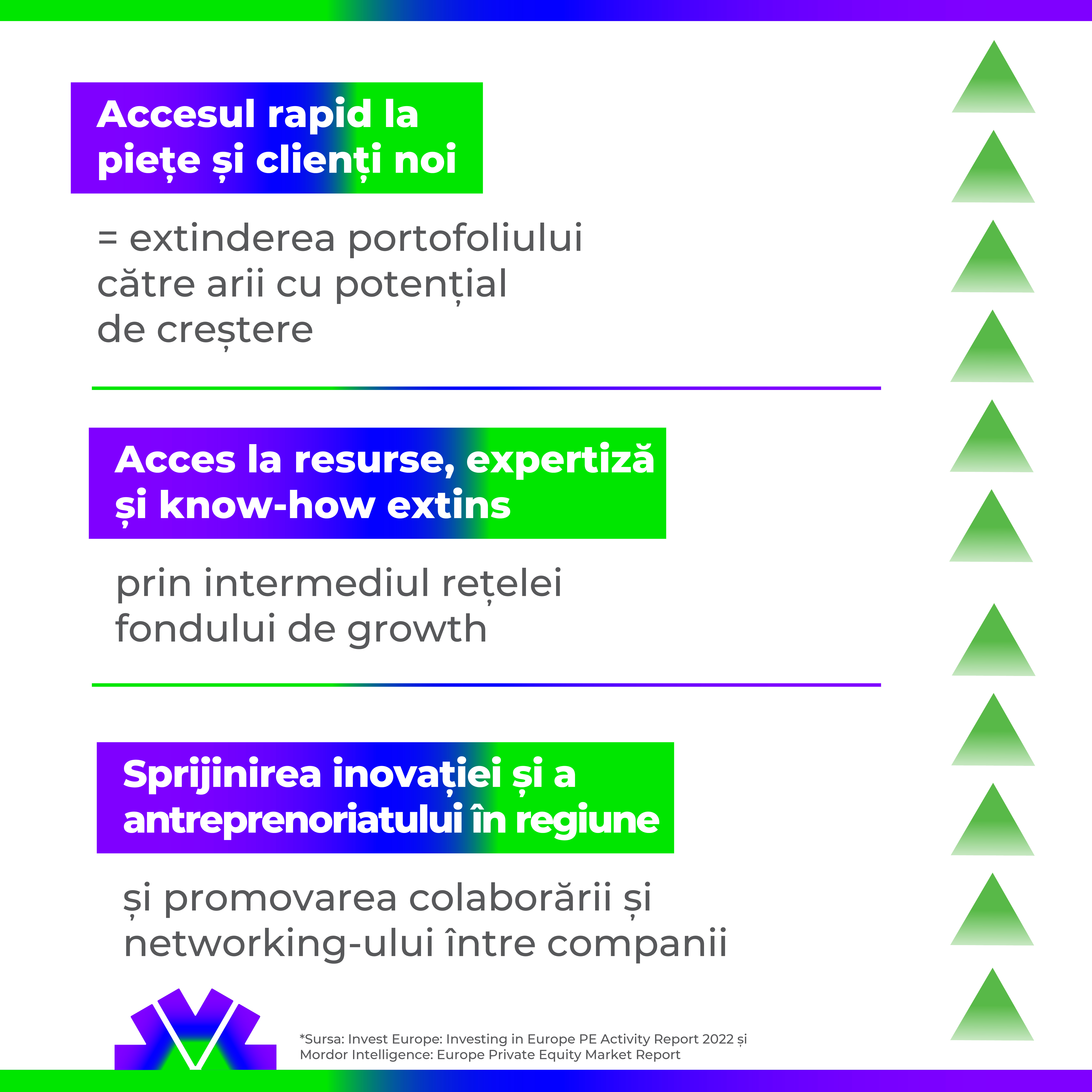 - Acces la resurse, expertiză și know-how extins prin intermediul rețelei fondului de growth