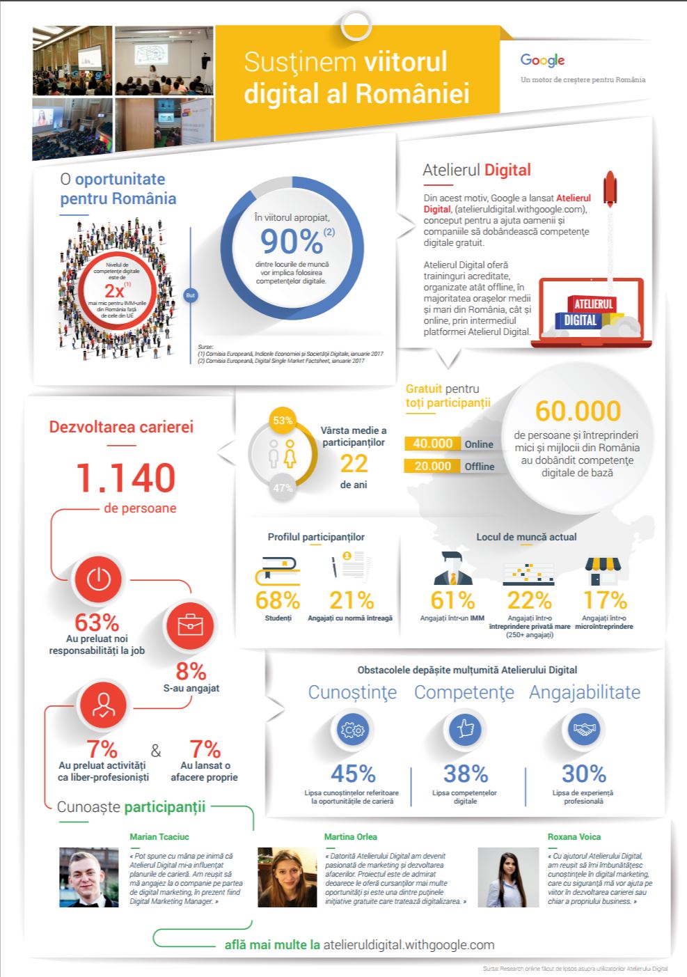 Google a lansat Atelierul Digital în aprilie 2016. Prin platforma digitală și seminarii desfășurate în cadrul unităților de învățământ superior, participanții au dobândit cunoștințe practice din diverse domenii: de lansarea unui business online, la crearea unui website de calitate sau dezvoltarea unei strategii online eficiente. Până în prezent peste 60.000 de persoane - studenți, antreprenori și angajați - au folosit programul Atelierul Digital pentru îmbunătățirea competențelor digitale: peste 20.000 de studenți pregătiți în cadrul seminariilor derulate în 45 de orașe din toată țara și 40.000 de utilizatori ai platformei online.