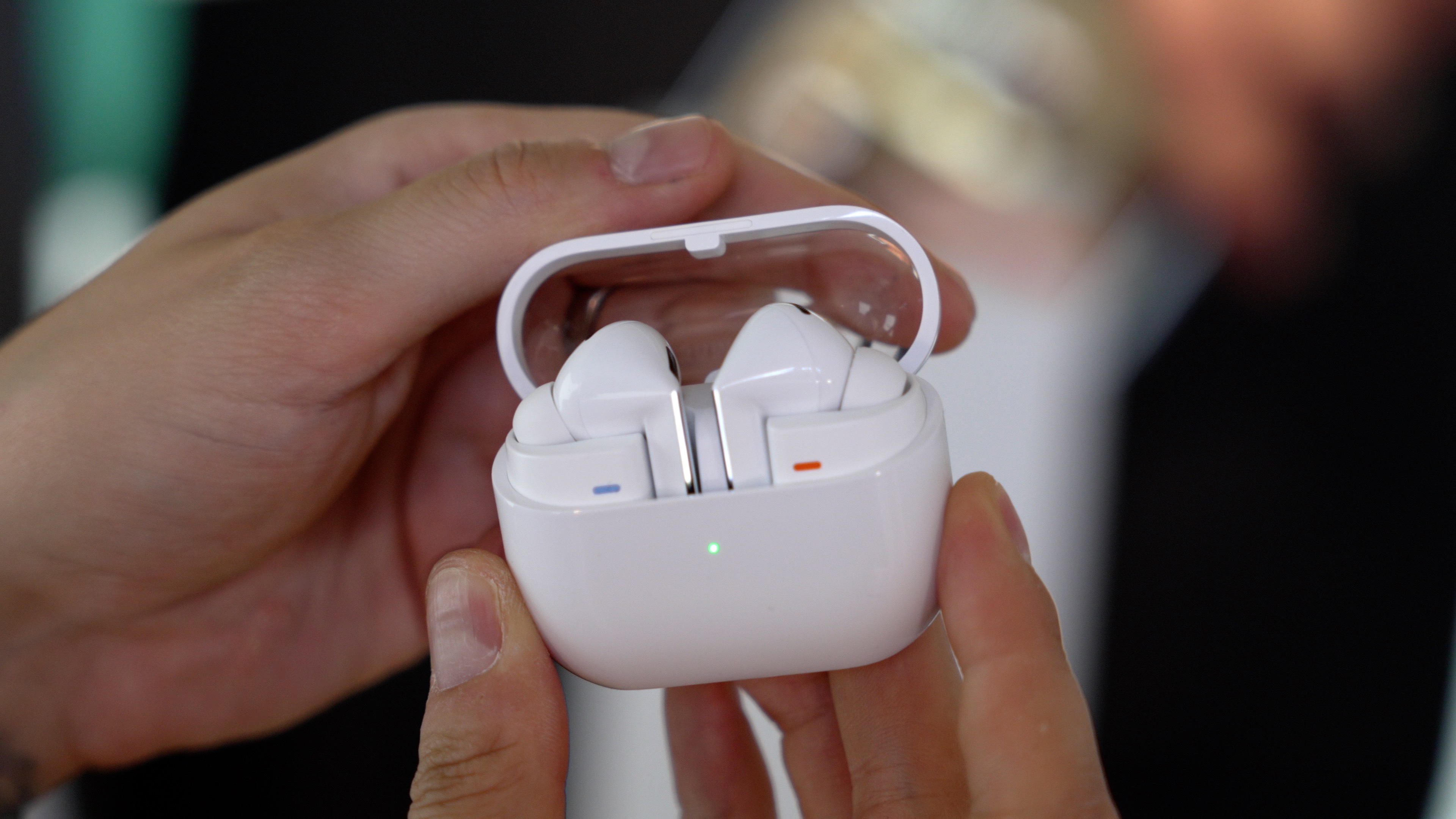Pe lângă ceasuri, avem două perechi de căști. Samsung Galaxy Buds 3 și Buds 3 Pro se remarcă prin faptul că au un capac al carcasei transparent, prin care vezi căștile, vin în două culori - gri și alb și sunt primele căști care împrumută designul de Airpods, adică au acele bețe pe margine, nu mai vorbim de Buds tradiționale Samsung. Tija de pe margine are o formă … interesantă. Dar arată un pic ciudățel și deloc discret - adică e o formă piramidală. Ce-i dau e că se apasă foarte ușor comenzile tactile, în schimb trebuie să-ți placă mult designul pentru a le alege. Buds 3 Pro au și dopuri pentru izolare fonică suplimentară, deși ambele au aceleași caracteristici. De asemenea varianta Pro are și niște LED-uri pe margine și căștile pot fi folosite și înregistrate în contul Samsung pentru a putea folosi inteligența artificială de pe telefoanele compatibile ale companiei.
