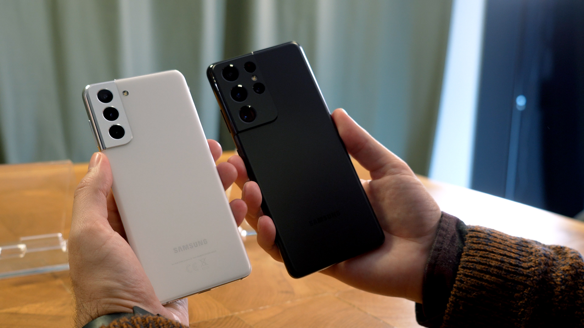 Ecranele sunt plate pe modelele S21 și S21+ și puțin curbat pe S21 Ultra și toate au o mică perforație pentru camera de selfie. Display-urile sunt protejate de sticlă Gorilla Glass 7, la fel și spatele S21 + și S21 Ultra, dar nu și cel de pe S21. Acesta este tot un fel de glastic, cel introdus pe Note 20, dar îmbunătățit să reziste mai bine la zgârieturi. Diferența nu e majora față de sticlă, aceasta fiind puțin mai alunecoasă. Ca să-ți dai seama dacă-ți place ar fi bine să testezi dispozitivul înainte să-l cumperi.