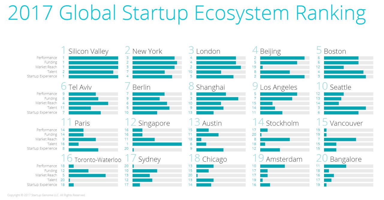 Astfel, raportul a identificat primele 20 de ecosisteme antreprenoriale ale lumii bazându-se pe performanță, finanțare, talent, potențial de piață sau experiență. Pe primul loc se află și în acest an Silicon Valley, urmat de New York și Londra – acesta din urmă, în urcare cu 3 poziții. Printre orașele nou intrate în acest clasament se află Beijing - locul 4 -, Shanghai – locul 8 – și Stockholm, care a intrat direct pe locul 14 prin prisma reach-ului pe care le au produsele startup-urilor de acolo și a abilității orașului scandinav de a crea unicorni (printre exemple, Spotify, Skype sau King).