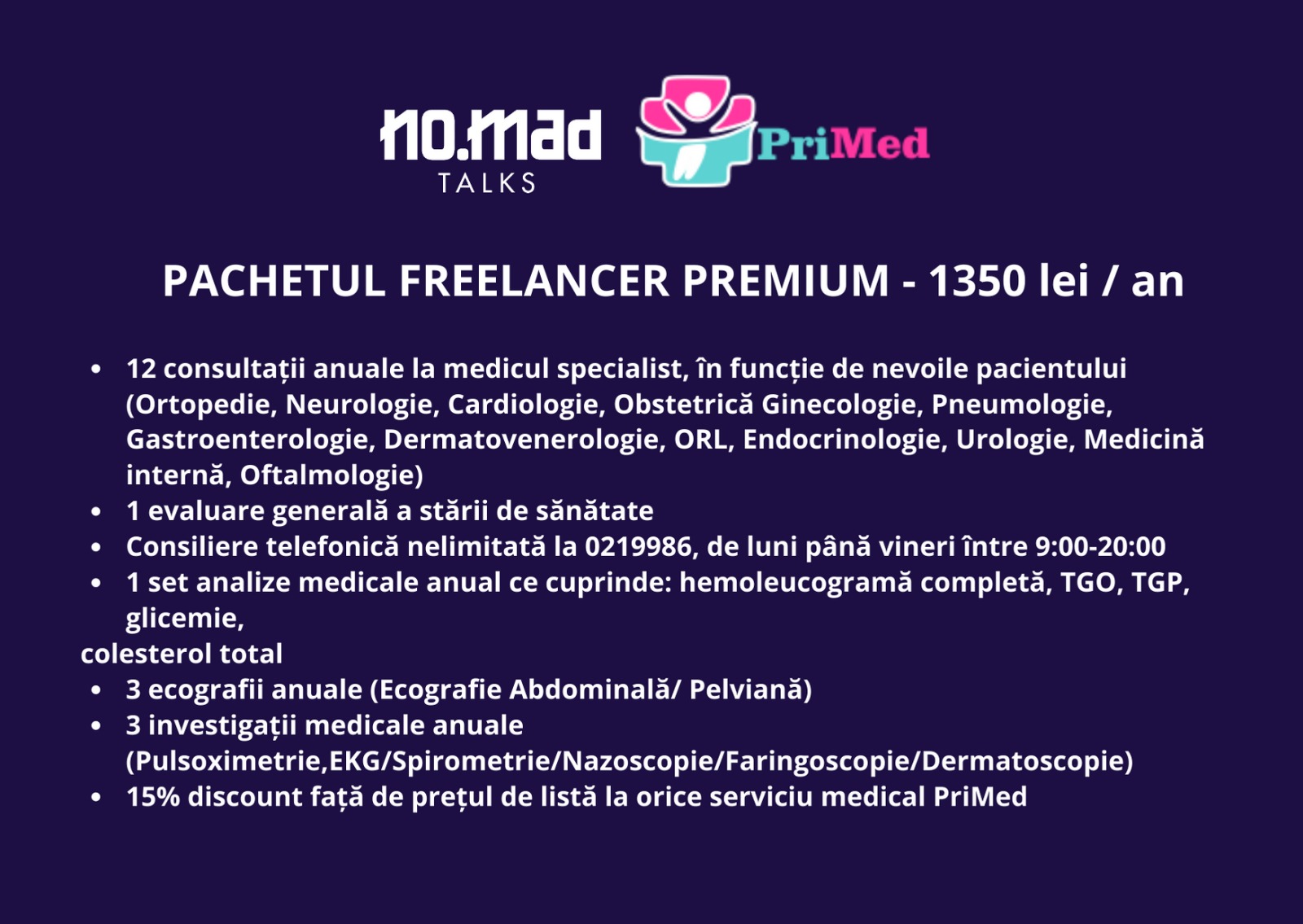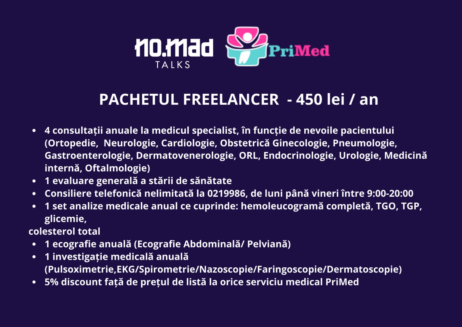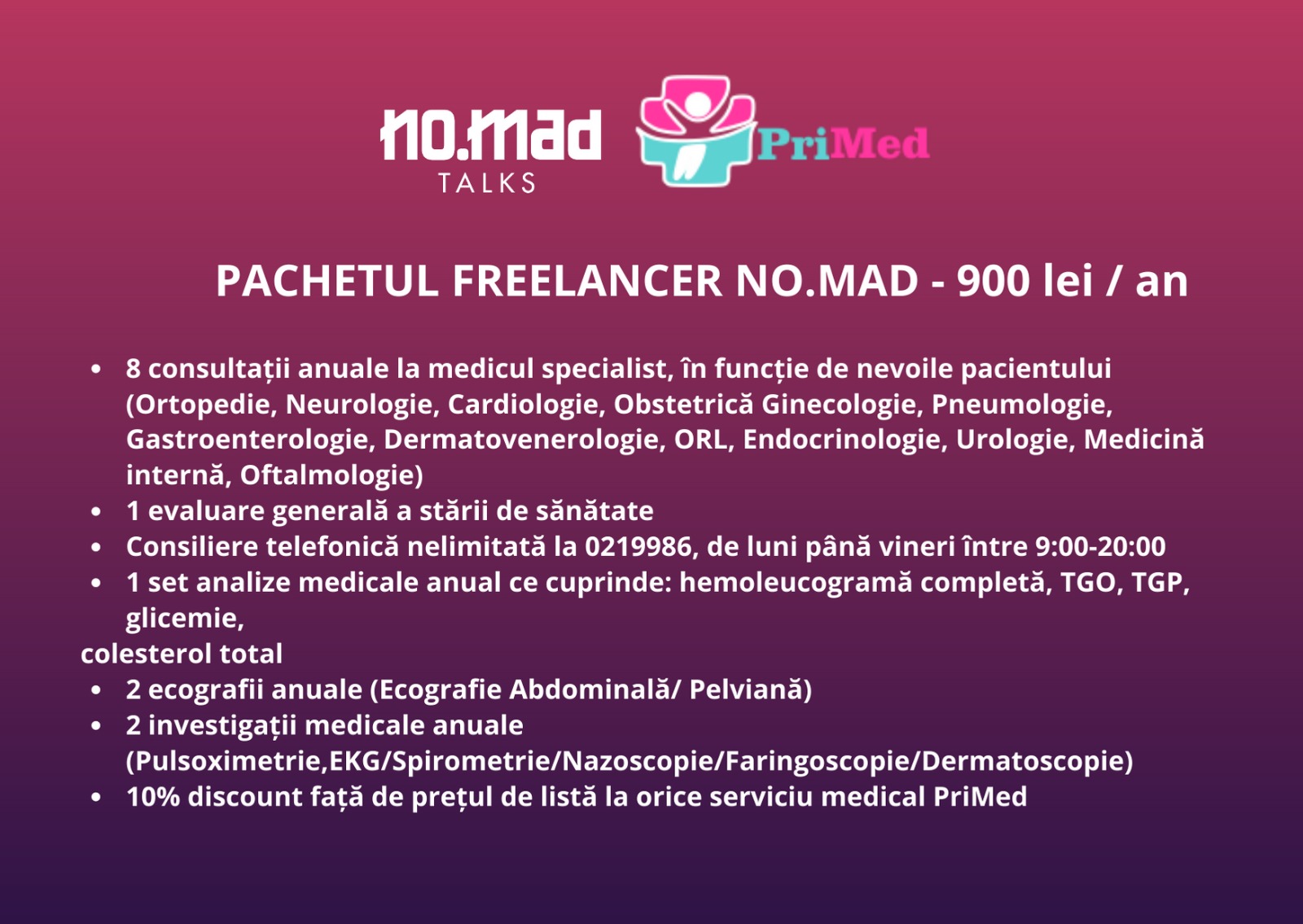 PriMed a gândit pentru comunitatea NO.MAD Talks trei pachete, Freelancer, Freelancer NO.MAD și Freelancer Premium, ce oferă consultații la medici specialiști, un set de analize medicale anuale, ecografii, investigații și consiliere telefonică pentru beneficiarii acestor asigurări. Detalii despre pachete aici iar acestea pot fi achiziționate contactând Clinica PriMed telefonic sau pe e-mail.
