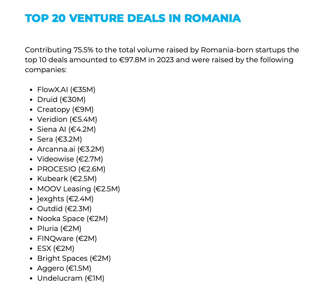 Pe parcursul lui 2023, 20 de companii au ridicat investiții care au reprezentat aproape jumătate din valoarea totală a investițiilor anului trecut. Mai exact, 900 de milioane de euro. Țara noastră a contribuit cu 7,2% în aceste top 20 de deal-uri, respectiv cu somma de 65 de milioane de euro.