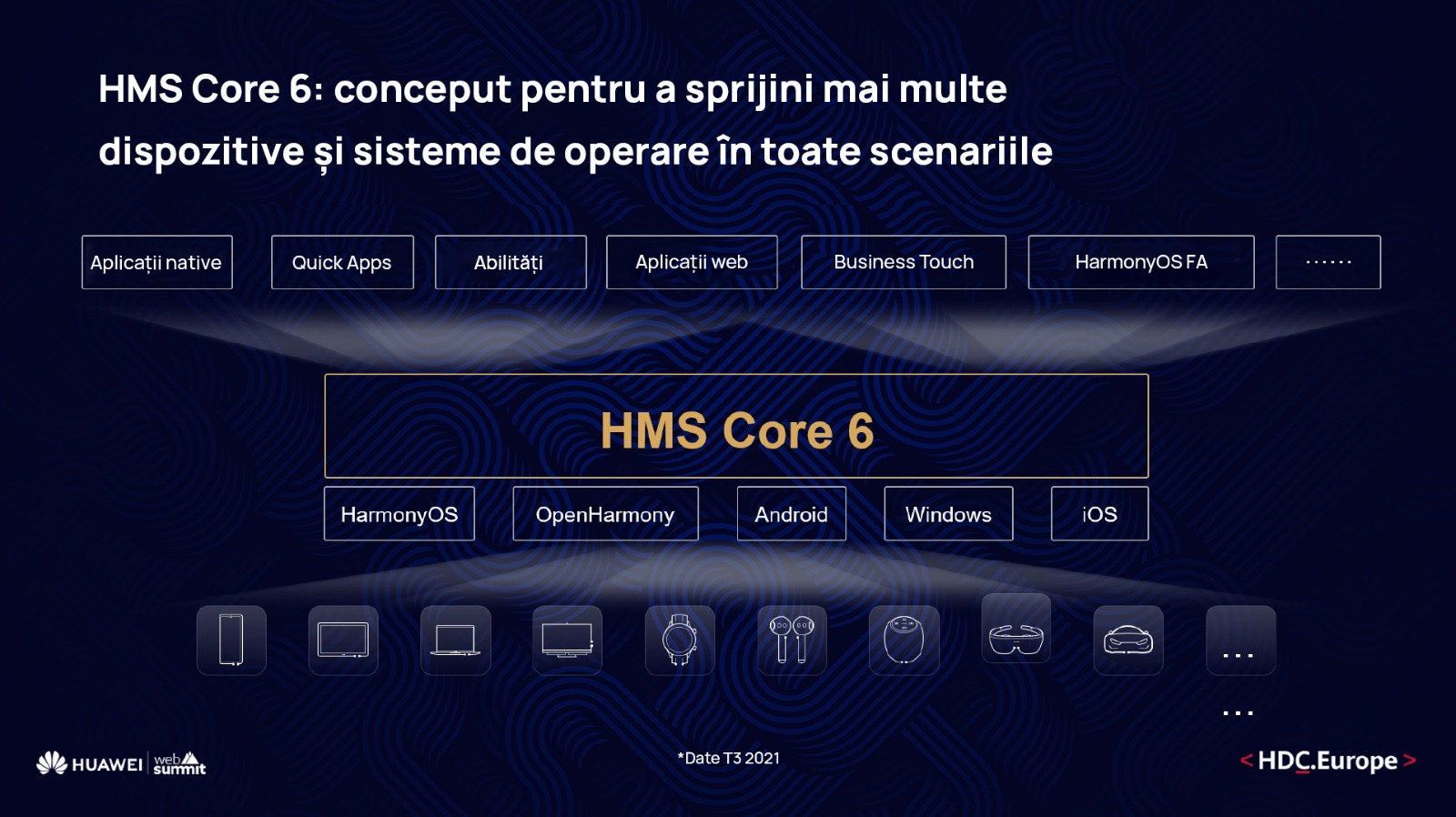 În cadrul Summit-ului Web au fost lansate kituri de dezvoltator HMS Core 6 pentru a sprijini crearea de funcții mai competitive pentru aplicații – un total de 69 Kituri și API-uri 21.738. Gama completă de capacități HMS Core va împuternici dezvoltatorii să creeze aplicații de calitate cu inteligența, soluțiile contextuale și bazate pe scenarii pentru mai multe dispozitive inteligente, inclusiv smartphone-uri, tablete, televizoare inteligente, dispozitive portabile și produse audio. Acestea pot fi, de asemenea, utilizate pentru a crea aplicații care rulează pe Android, HarmonyOS și iOS.