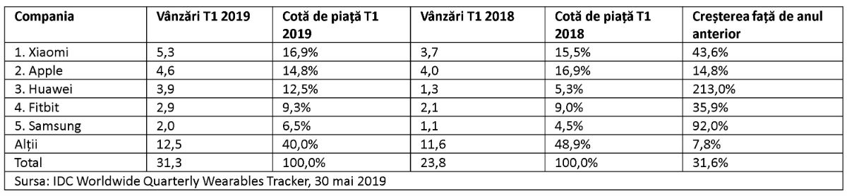 Top 5 al companiilor producătoare de gadgeturi wearable, numai gadgeturile purtate la încheietura mâinii, în funcție de volumul vânzărilor, cota de piață și creșterea față de anul anterior, T1 2019 (vânzări în milioane)