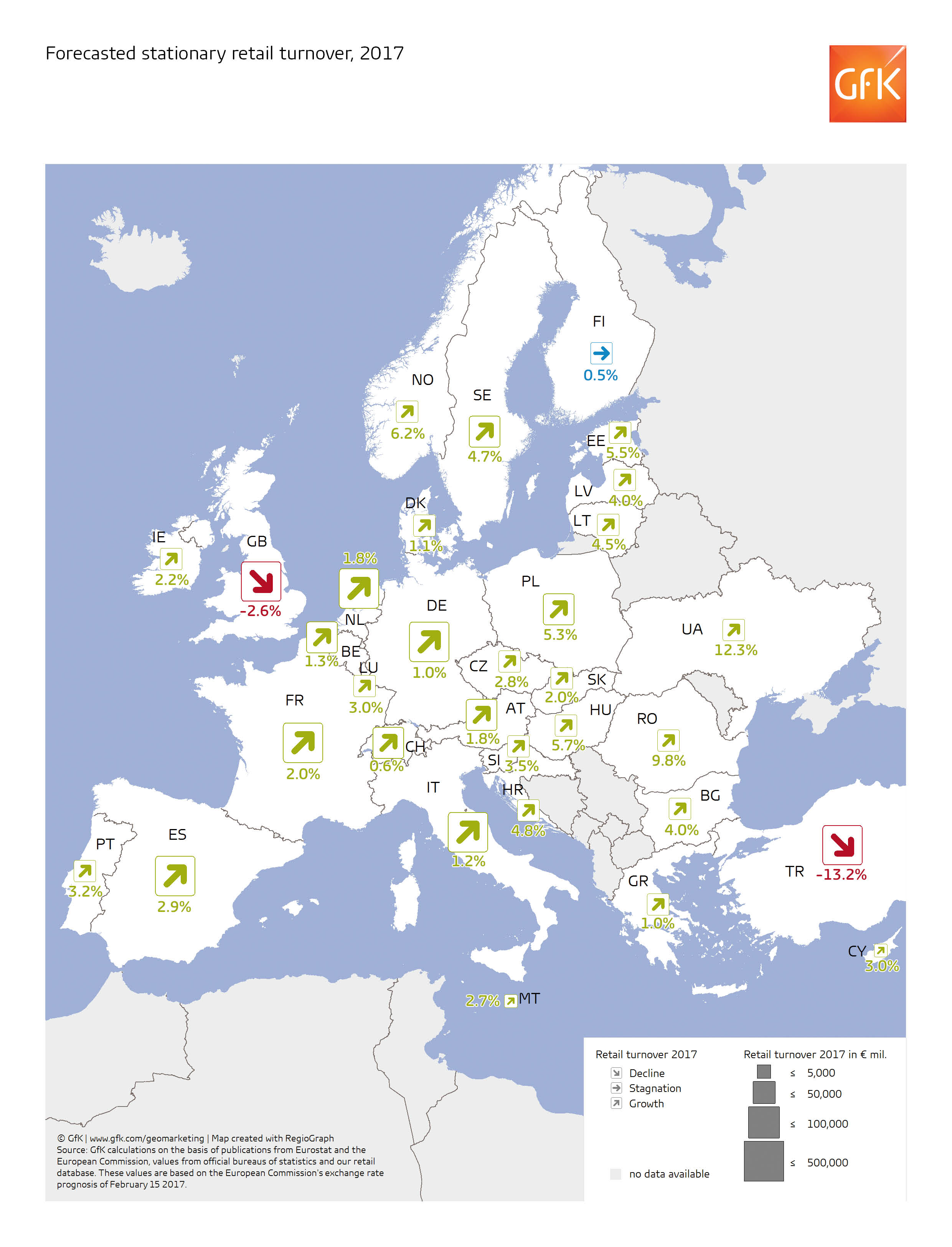 GfK estimează o creștere de 1,5% a afacerilor din retail. Dacă excludem Marea Britanie, cifra ajunge la peste 2%. Țările campioane de anul trecut sunt în prim-plan și în 2017. În special România (aproape 10%) și Ungaria (în jur de 6%) au rate de creștere dinamice. GfK estimează o creștere între 4 si 5,5% pentru Croația, Bulgaria și țările baltice, iar în Polonia puțin peste 5%, grație aprecierii zlotului polonez, precum și creșterii veniturilor și a prețurilor. După un declin de doi ani, retailerii din Grecia pot respira ușurați datorită unei creșteri de un procent prognozat pentru 2017.