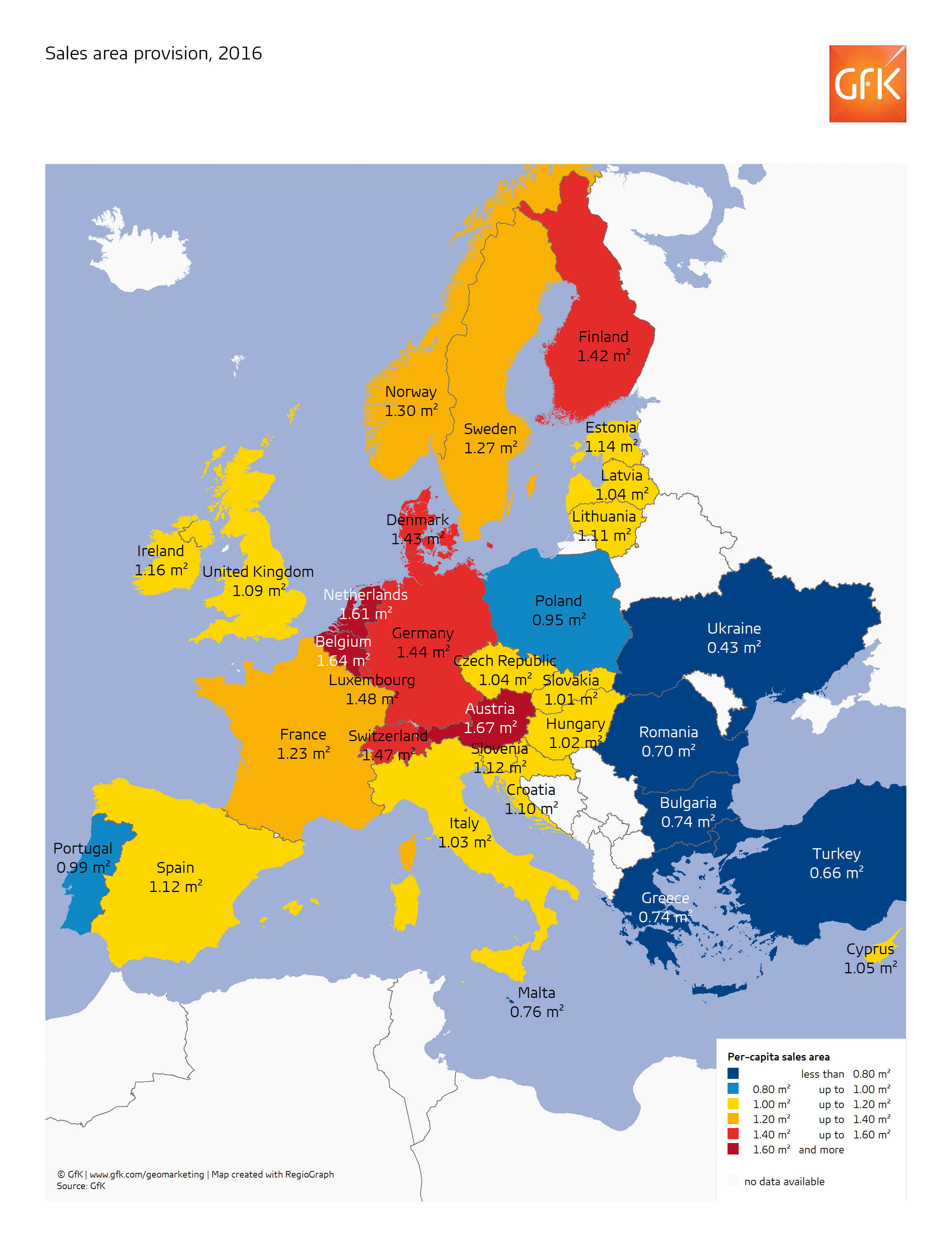 Pe ansamblu, profitabilitatea a crescut în UE cu aproape un procent în 2016. Pentru că și populația a crescut în același interval de timp, profitabilitatea spațiilor a crescut cu 0,4%, ajungând la o medie de 1.17mp pe cap de locuitor. Dar valorile diferă foarte mult de la o țară la alta. Austria și Olanda nu au reușit să atingă aceleași valori la acest capitol în 2016, comparativ cu anul precedent.
