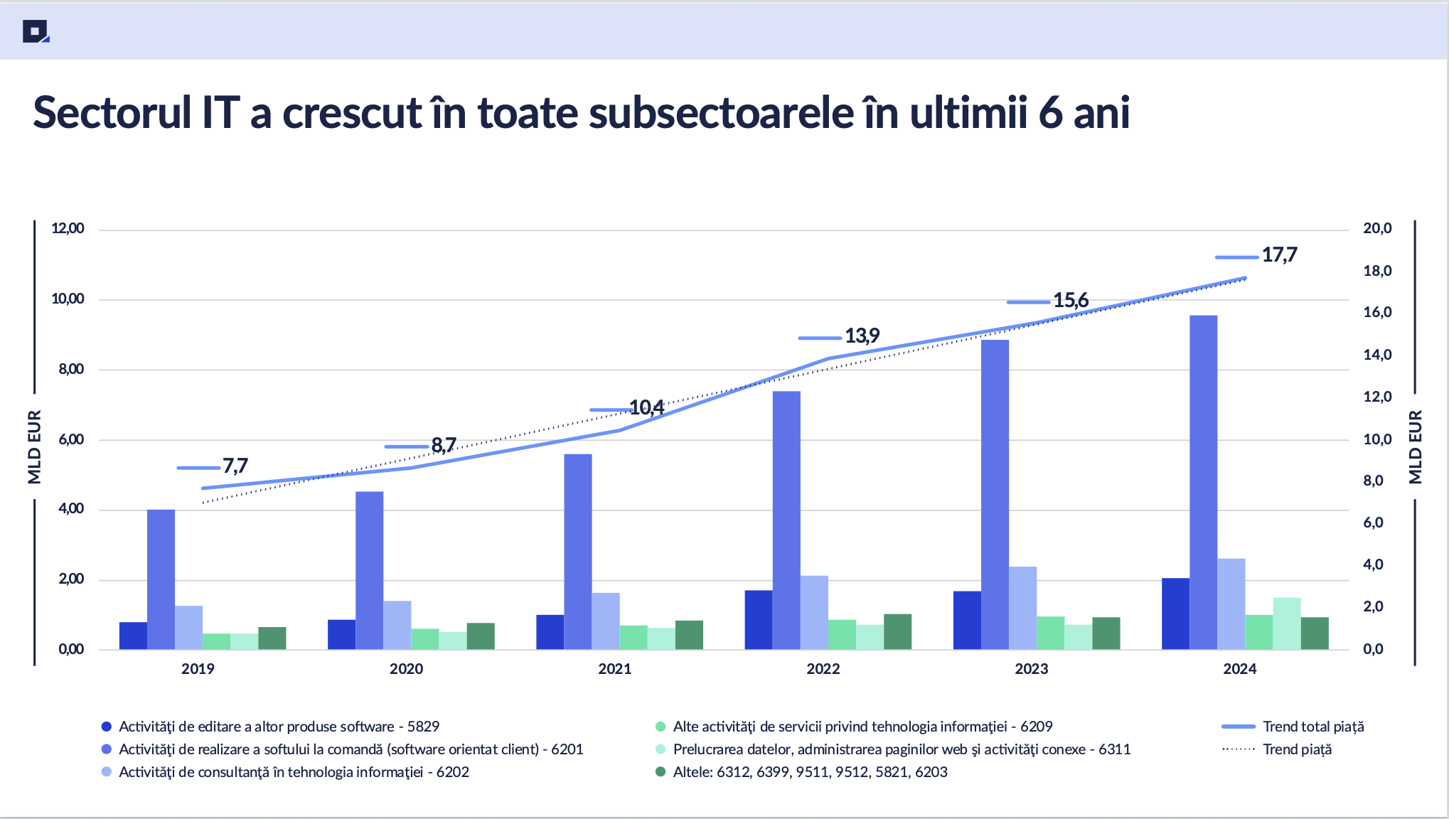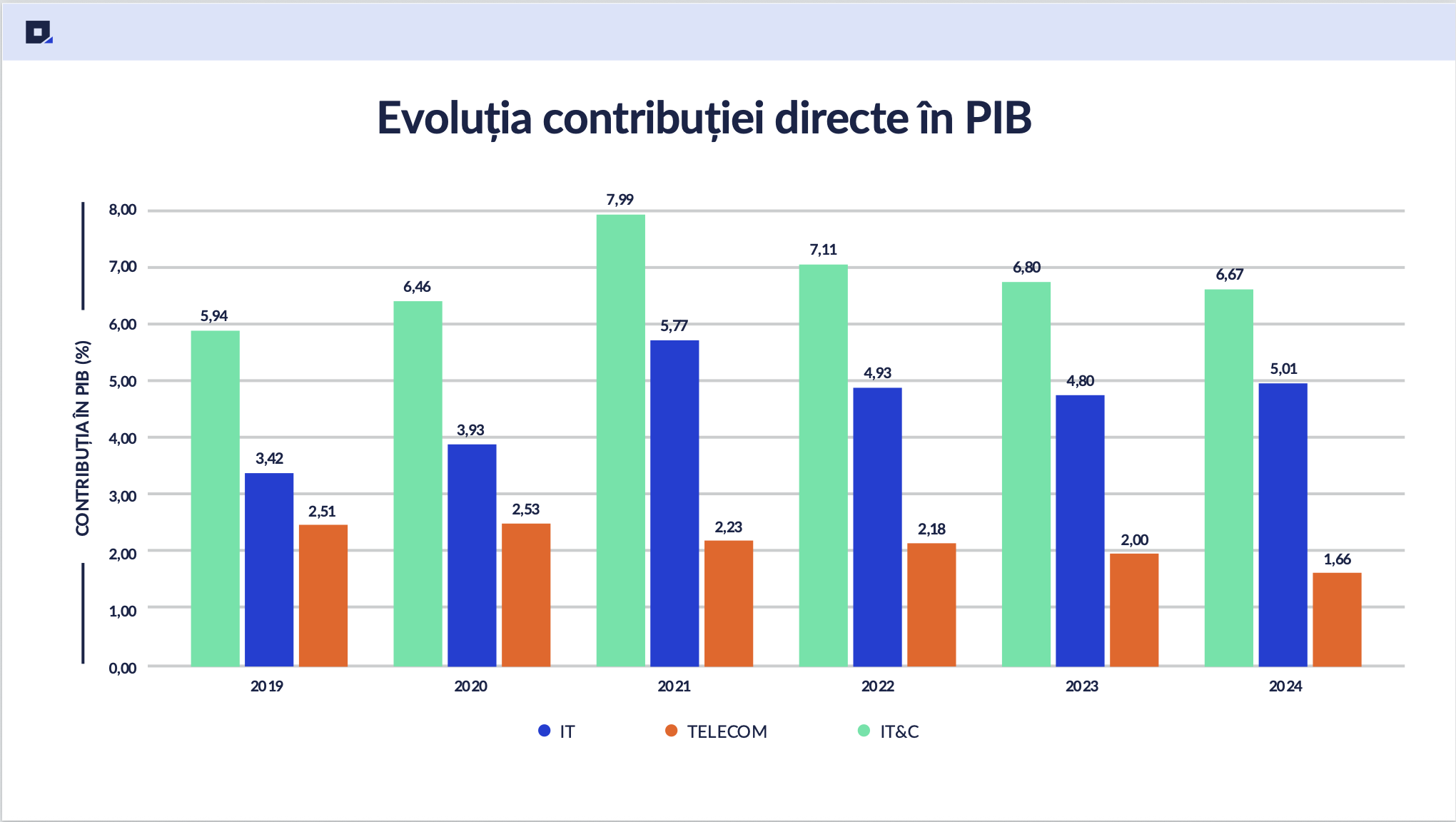 Cifra de afaceri totală a sectorului IT&C a ajuns la 23,6 miliarde EUR în 2024, evoluție susținută în principal de segmentul IT, care a urcat la 17,7 miliarde EUR. Contribuția directă la PIB rămâne ridicată și s-a situat la 6,67%, ușor sub nivelul din 2023 (6,8%), o evoluție care reflectă atât contextul economic general, cât și presiunea asupra investițiilor viitoare.