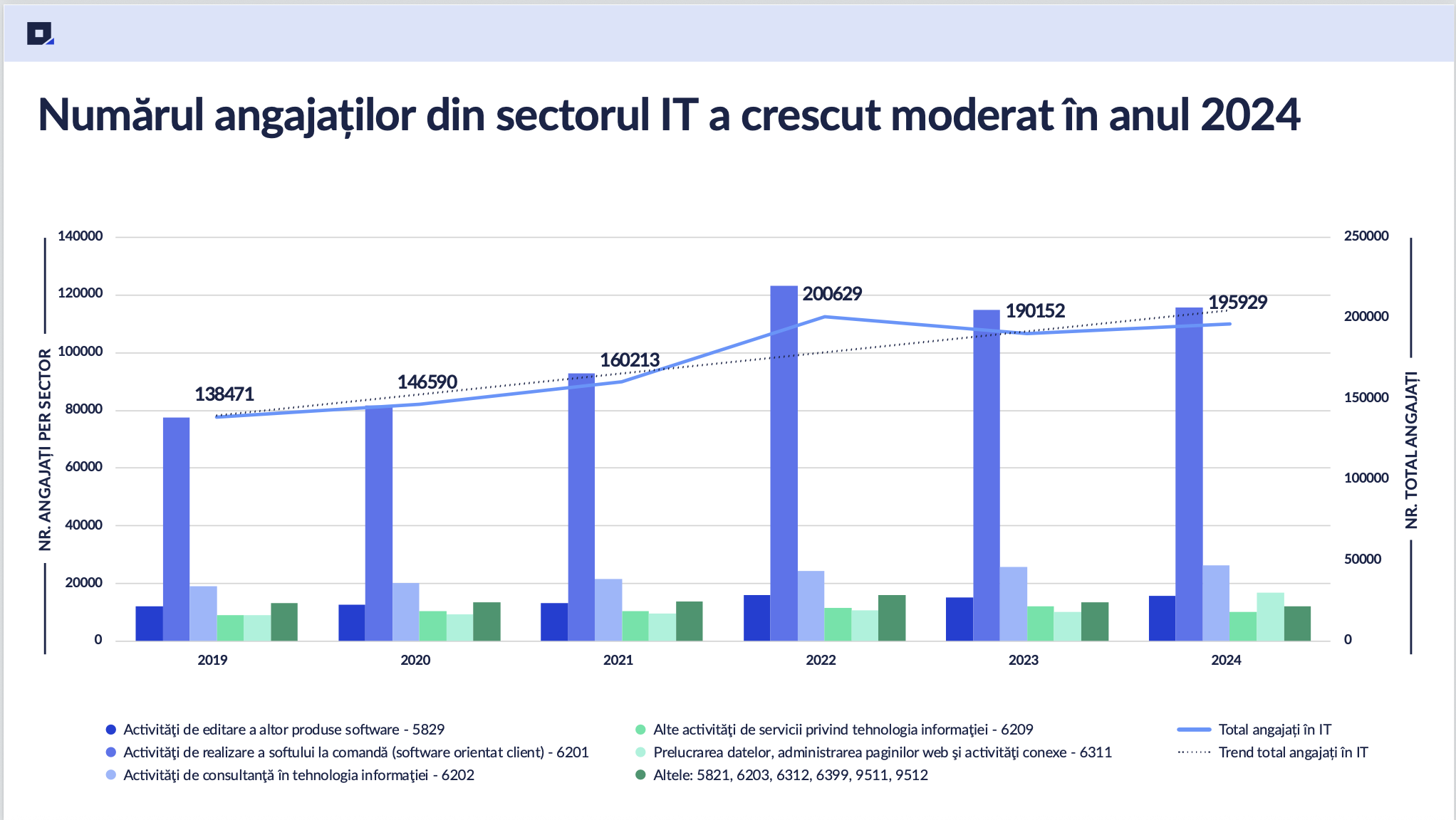 Numărul angajaților în IT a ajuns la 195.929 în 2024, o creștere modestă față de 2023, dar sub nivelul record atins în 2022. Totuși, presiunea pe costurile salariale este evidentă: