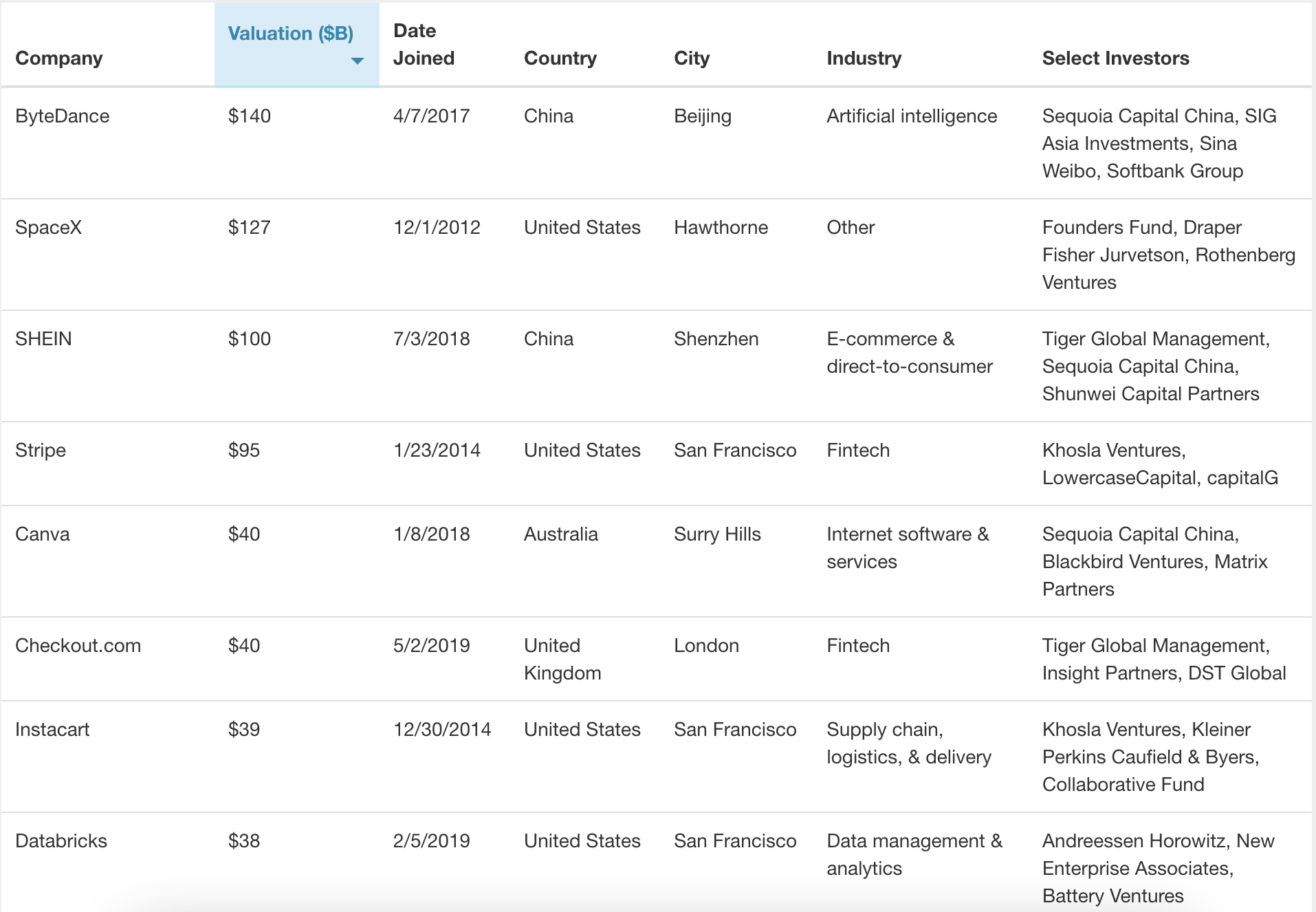 SpaceX, producător din industria aerospațială, este evaluat la 127 de miliarde dolari, Shein, o companie din domeniul modei, valorează 100 de miliarde de dolari, procesatorul de plăți electronice Stripe are o evaluare de circa 95 de miliarde de dolari, Canva, un tool colaborativ de design online, și platforma de plăți Checkout.com au fiecare câte 40 de miliarde de dolari evaluare.