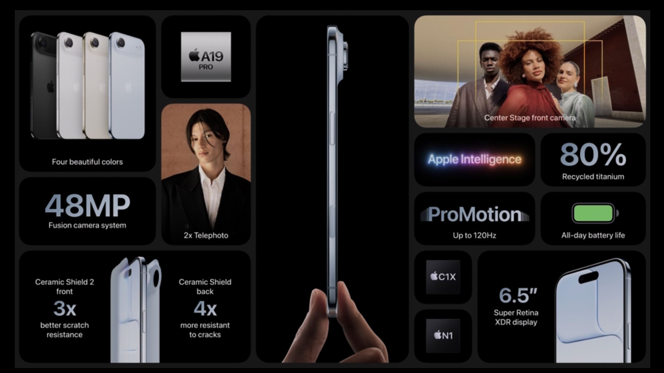 iPhone Air este un telefon de doar 5,6 milimetri, cel mai subțire de până acum de la Apple, cu un ecran ProMotion de 6,5 inch și cu luminozitate de 3.000 de niți. Este mai rezistent la zgârieturi și are Ceramic Shield pe față, dar și pe spate.