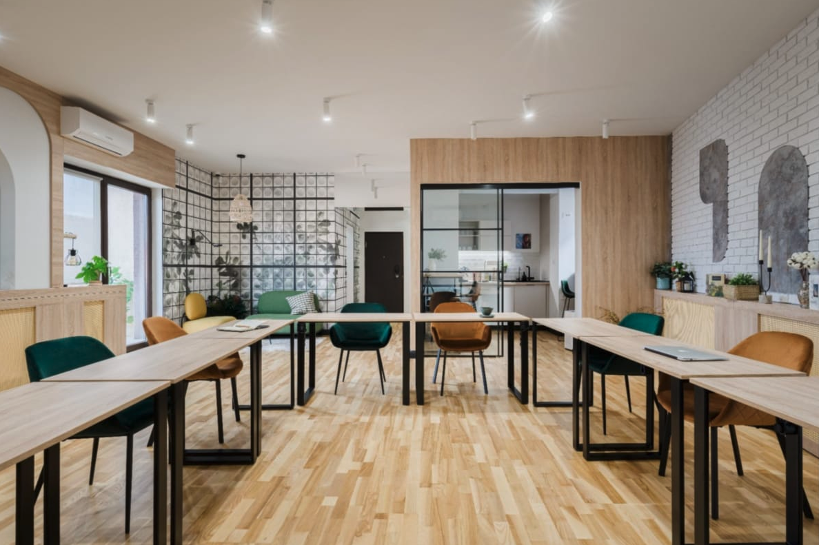 Într-un astfel de spațiu, designul este la fel de important ca funcționalitatea. Mobilierul ergonomic, accentele de design modern și integrarea materialelor naturale creează un mediu care motivează și inspiră.