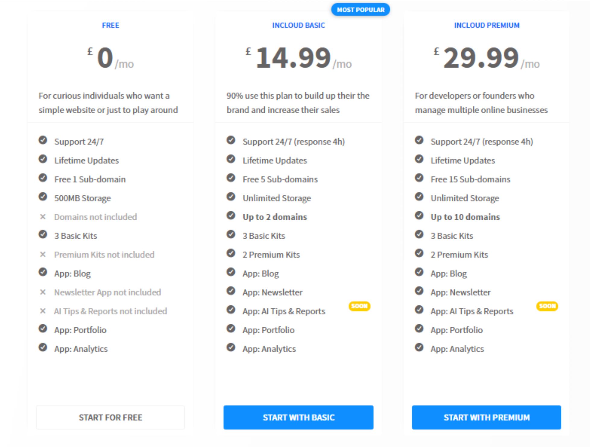 În mod gratuit vei putea folosi Monte pentru a construi doar un website și să adauge planuri suplimentare pentru aplicații și mai multe domenii. Planul InCloud Basic, care oferă suport pentru două domenii, costă 15 lire sterline pe lună, iar InCloud Premium costă 30 de lire sterline pe lună și permite până la 10 domenii. Pentru 100 de lire sterline, programatorii pot descărca Monte, să-l pună pe serverul lor și să lucreze la 10 proiecte comerciale sau non-comerciale.