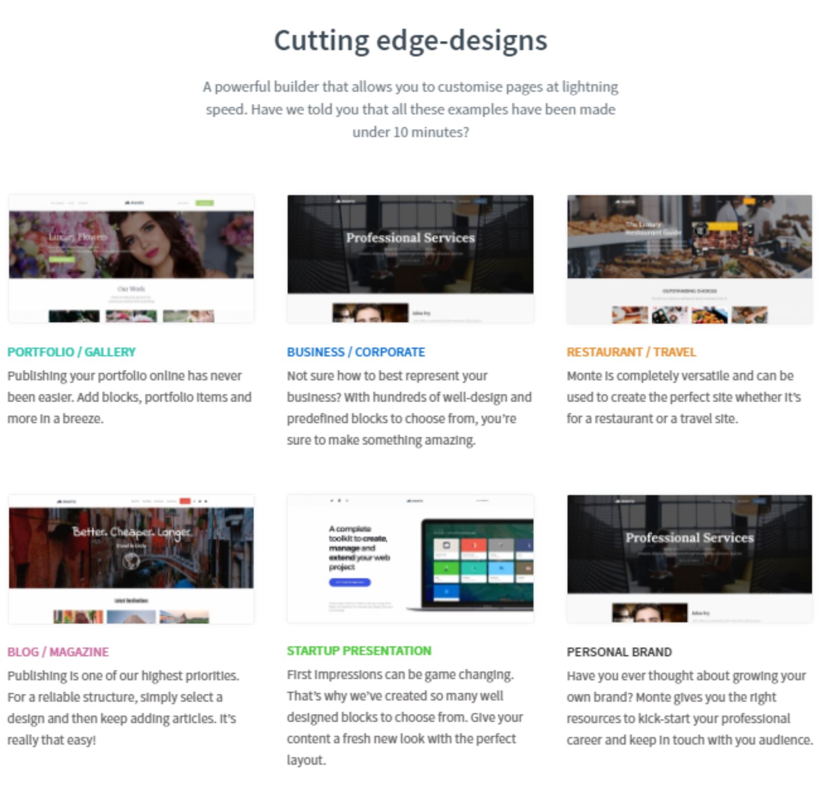 În momentul lansării, Monte are patru kit-uri diferite de aplicații, cu câte 60 de blocuri fiecare. Cei doi moldoveni definesc blocurile ca funcții pe care le poți adăuga site-ului. "Blocurile sunt repartizate pe categorii, texte, features, imagini, galerii foto, portofoliu, bloguri", spune Grigore Dodon.