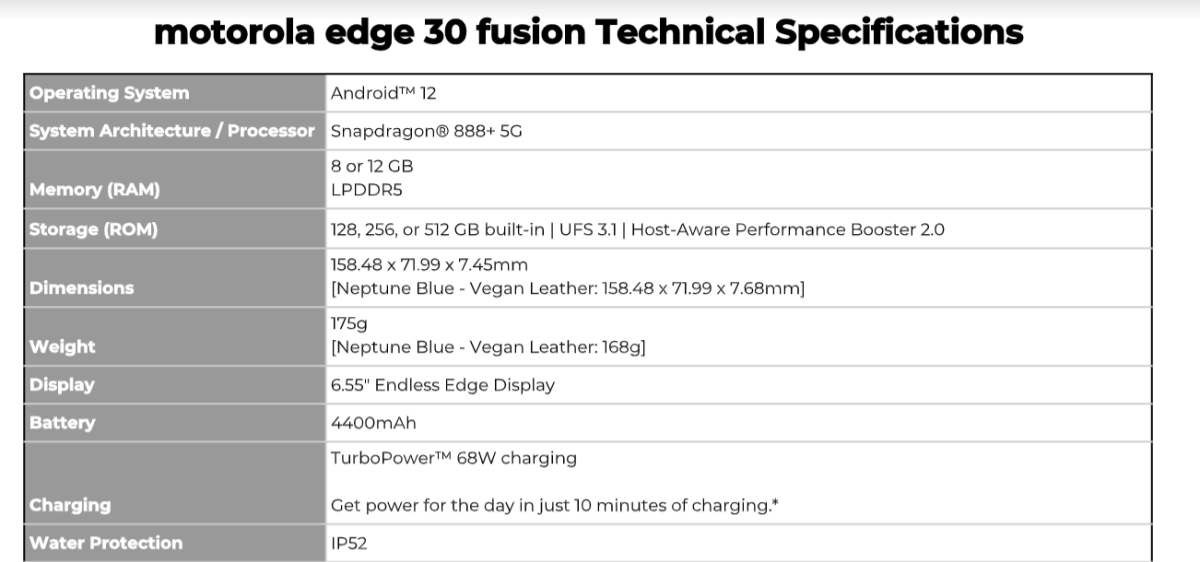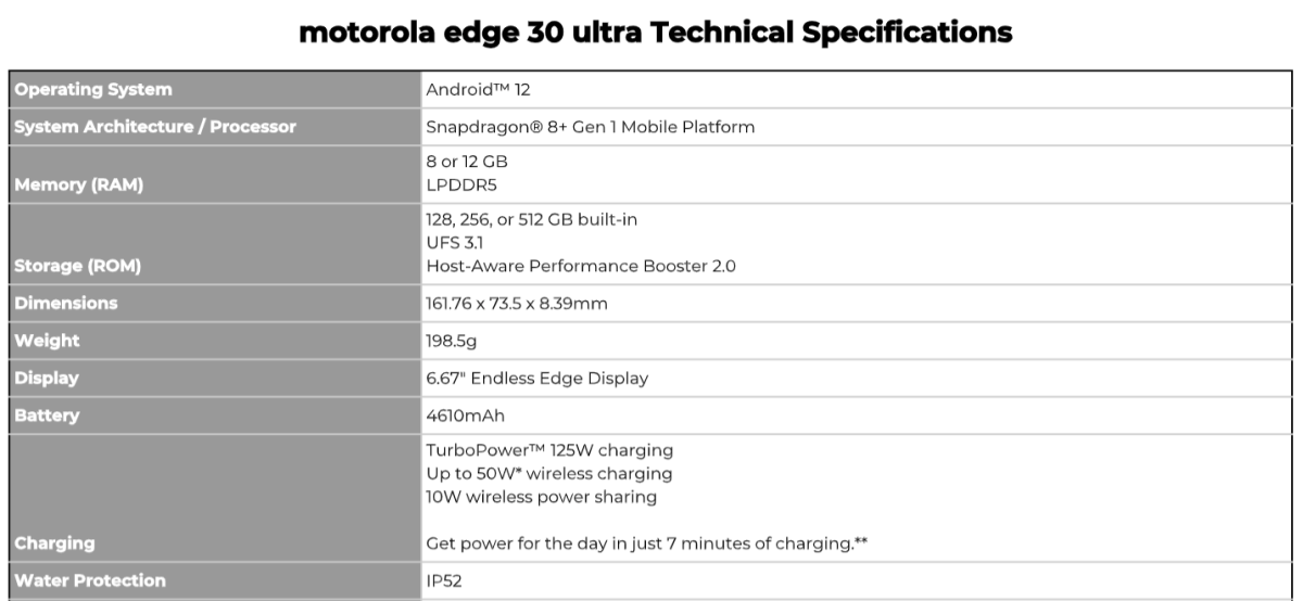 Smartphone-ul 5G, cu Android 12, are un profil slim, display borderless, însă o dimensiune puțin mai redusă față de edge 30 ultra, de 6,55 inci, un procesor Snapdragon 888 și un sistem de camere foarte bun: 50 de megapixeli, lentilă de 13 megapixeli ultrawide & macro, și o cameră selfie de 32 megapixeli. Camera filmează 8K UHD (30fps), 4K UHD (60/30fps), FHD (60/30fps).