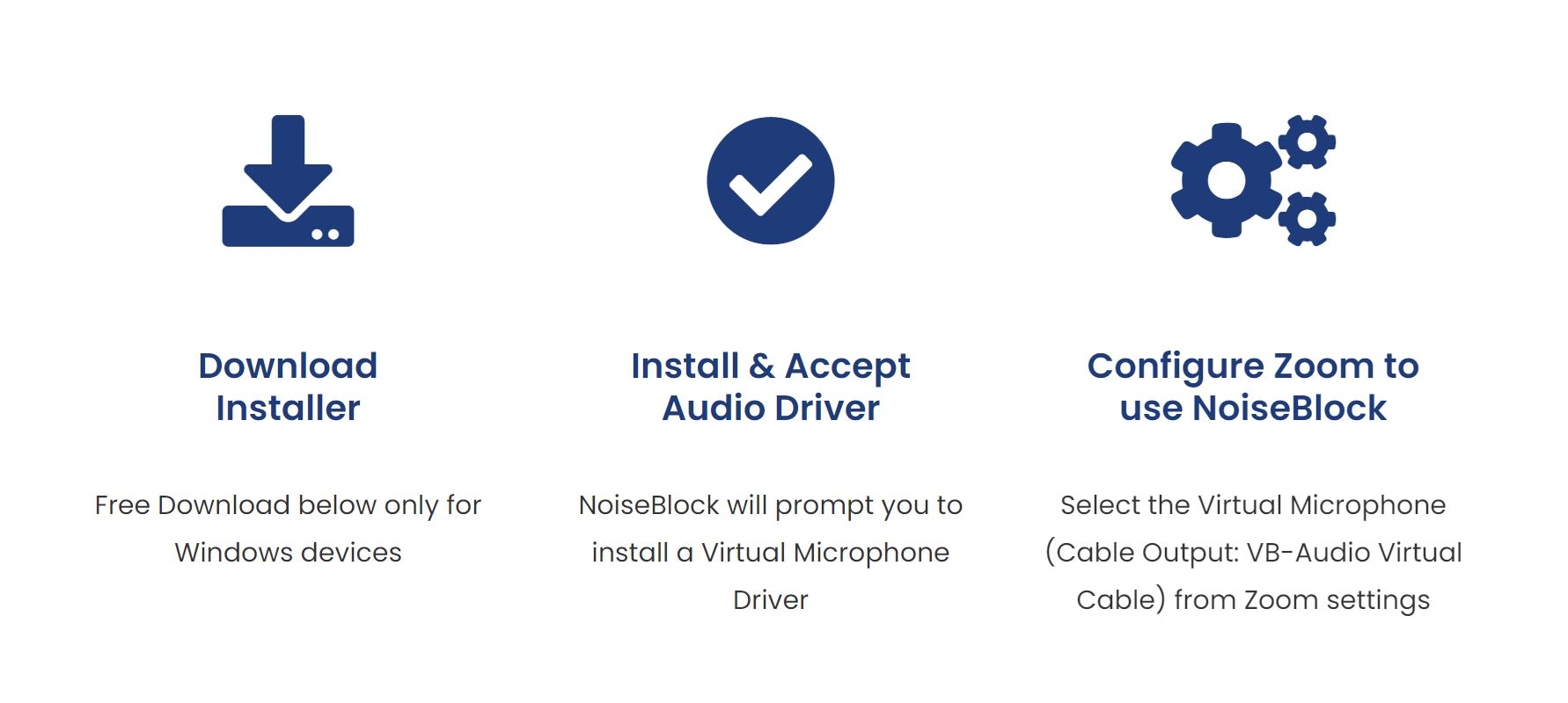 Practic aplicația se instalează pe calculator, apoi creează un profil de microfon virtual și ulterior în aplicația de videocall favorită trebuie să selectezi microfonul virtual al NoiseBlock pentru a funcționa așa cum trebuie.