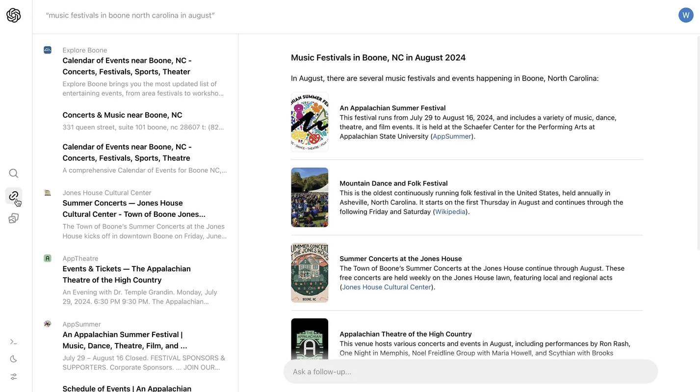 Motorul de căutare începe cu o casetă de text mare care întreabă utilizatorul „Ce căutați?”. Dar, mai degrabă decât să returneze o listă simplă de link-uri, SearchGPT încearcă să le organizeze și să le dea sens, notează The Verge. Într-un exemplu, motorul de căutare rezumă constatările sale privind festivalurile de muzică și apoi prezintă scurte descrieri ale evenimentelor, urmate de un link de atribuire.