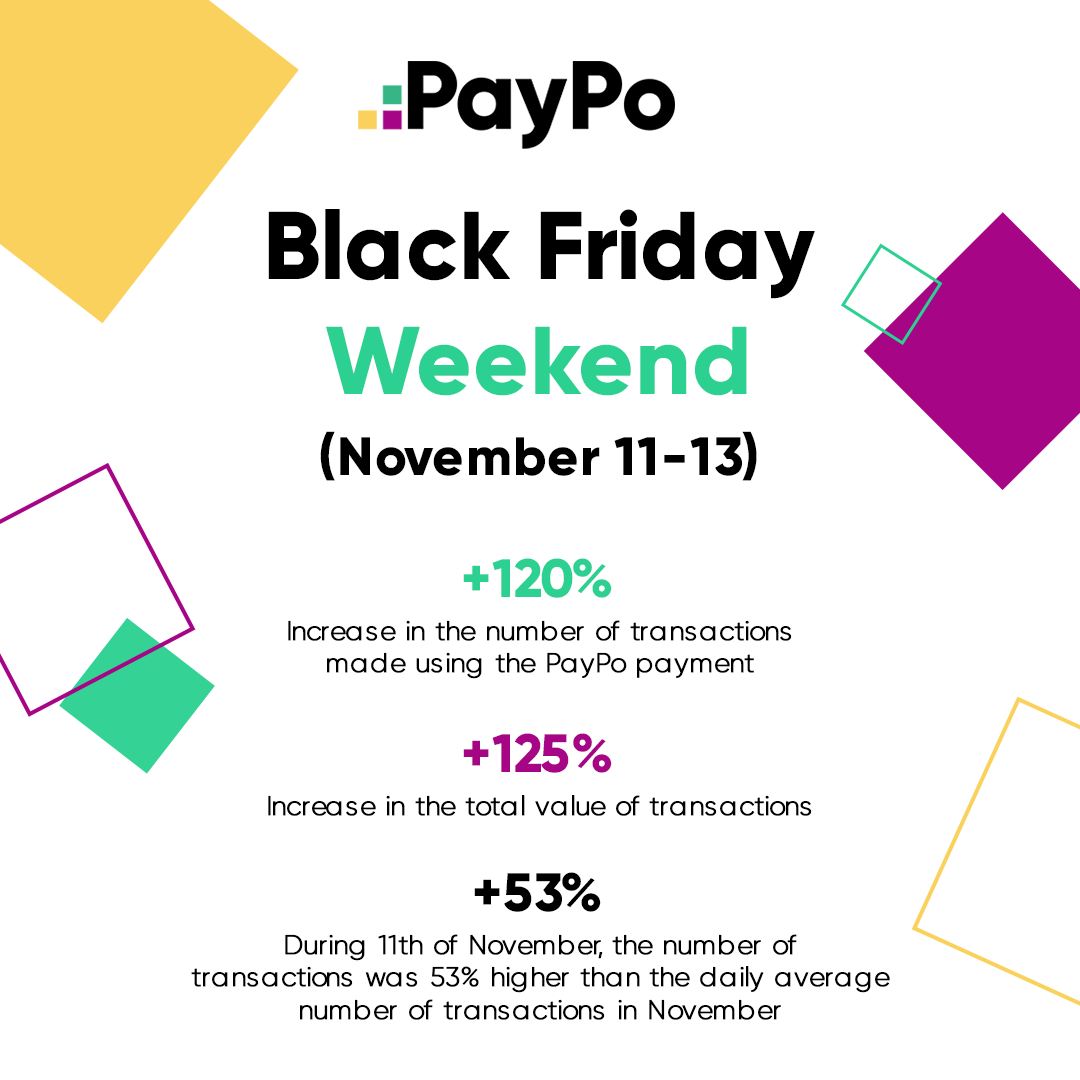 Conform PayPo, valoarea totală a tranzacțiilor plătite prin PayPo a crescut cu 125% în timpul aceluiași weekend comparativ cu weekendul precedent. De asemenea, numărul de tranzacții în ziua de Black Friday de 11 noiembrie a fost cu 53% mai mare decât media zilnică a numărului de tranzacții din noiembrie.