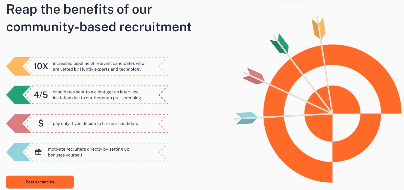 Huntly este un astfel de marketplace, care oferă angajatorilor IT acces la anunțuri gratuite de angajare și un sistem de plată flexibil, ceea ce le permite reducerea costurilor față de colaborarea cu o agenție de recrutare (comision de 5-7% vs. 15-20%).