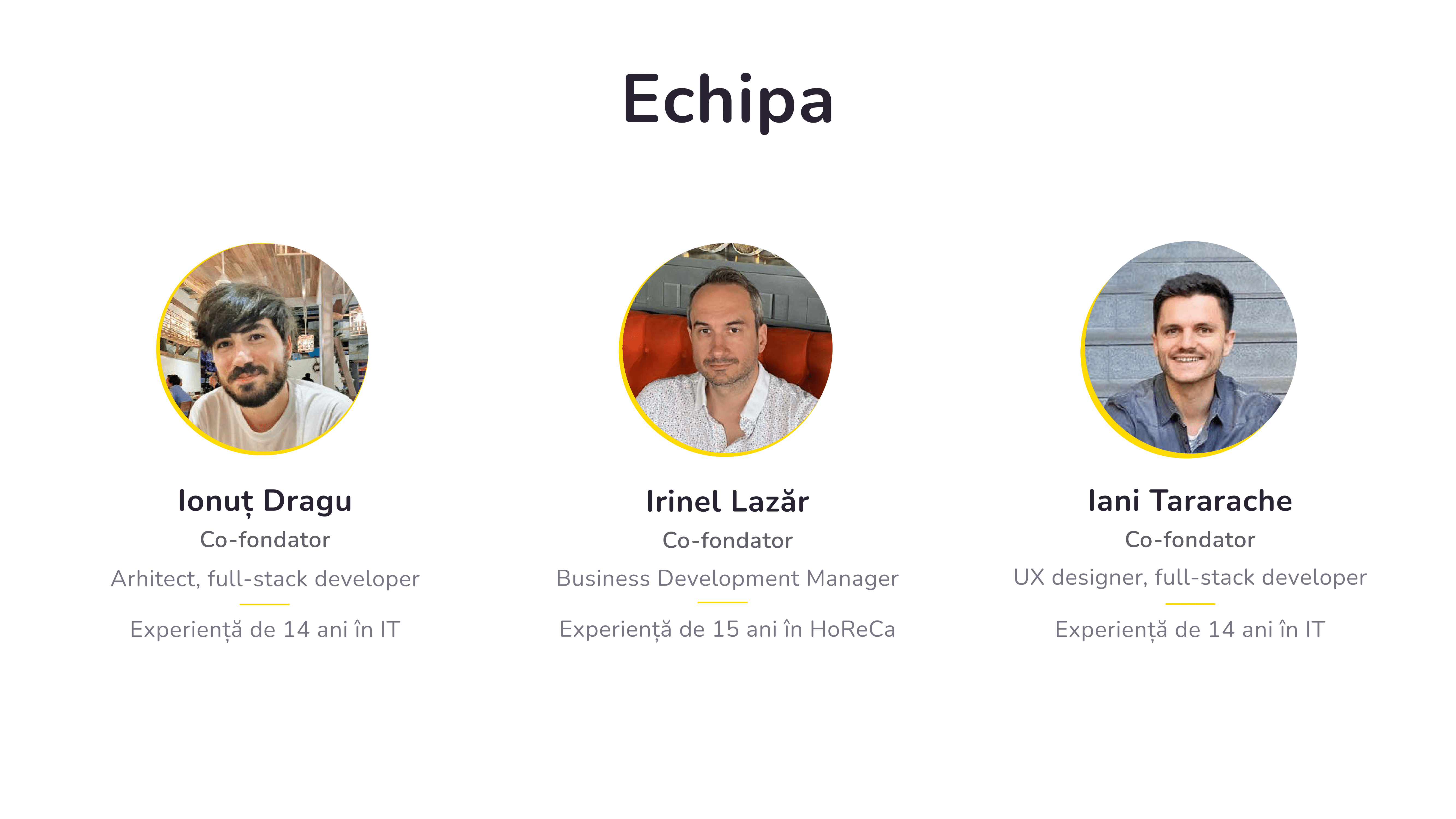 Așa au gândit și cei 3 co-fondatori ai Poftigo, echipă formată din: Irinel Lazăr, care are rolul de sales manager și aduce în proiect o experiență de 16 ani ca manager de restaurant, Iani Tararache și Ionuț Dragu, entuziaști ai tehnologiei, fiecare cu câte 15 ani experiență în software development, dar și în antreprenoriat, dezvoltând editura pentru copii Katartis.