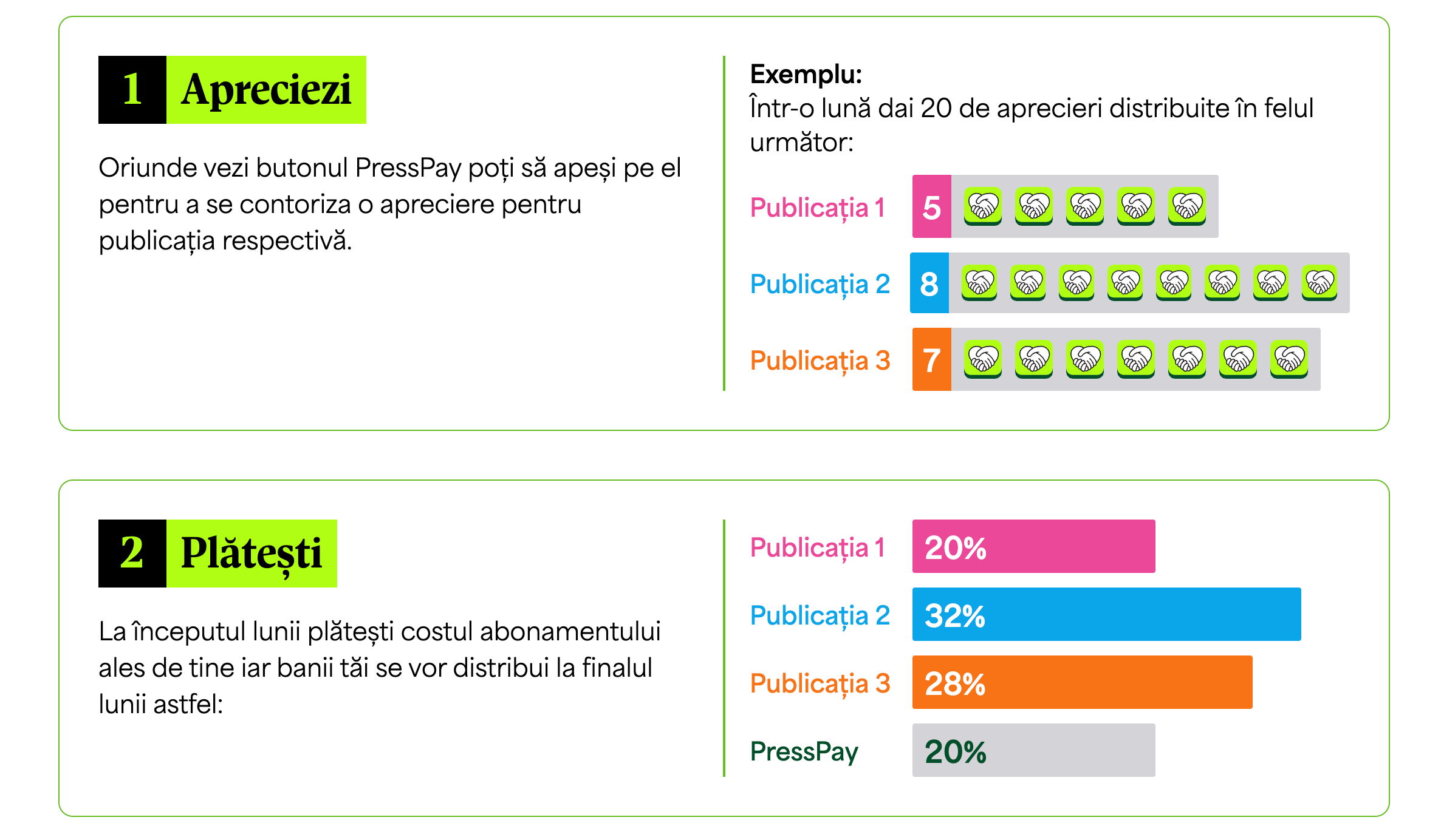 - în funcție de câte like-uri au dat și ce abonament au, banii plătiți de ei se distribuie publicațiilor după o schemă logică. Publicația de unde un abonat a avut cele mai multe articole care i-au plăcut primește cea mai mare bucată din cașcaval și apoi urmează redistribuirea către celelalte.