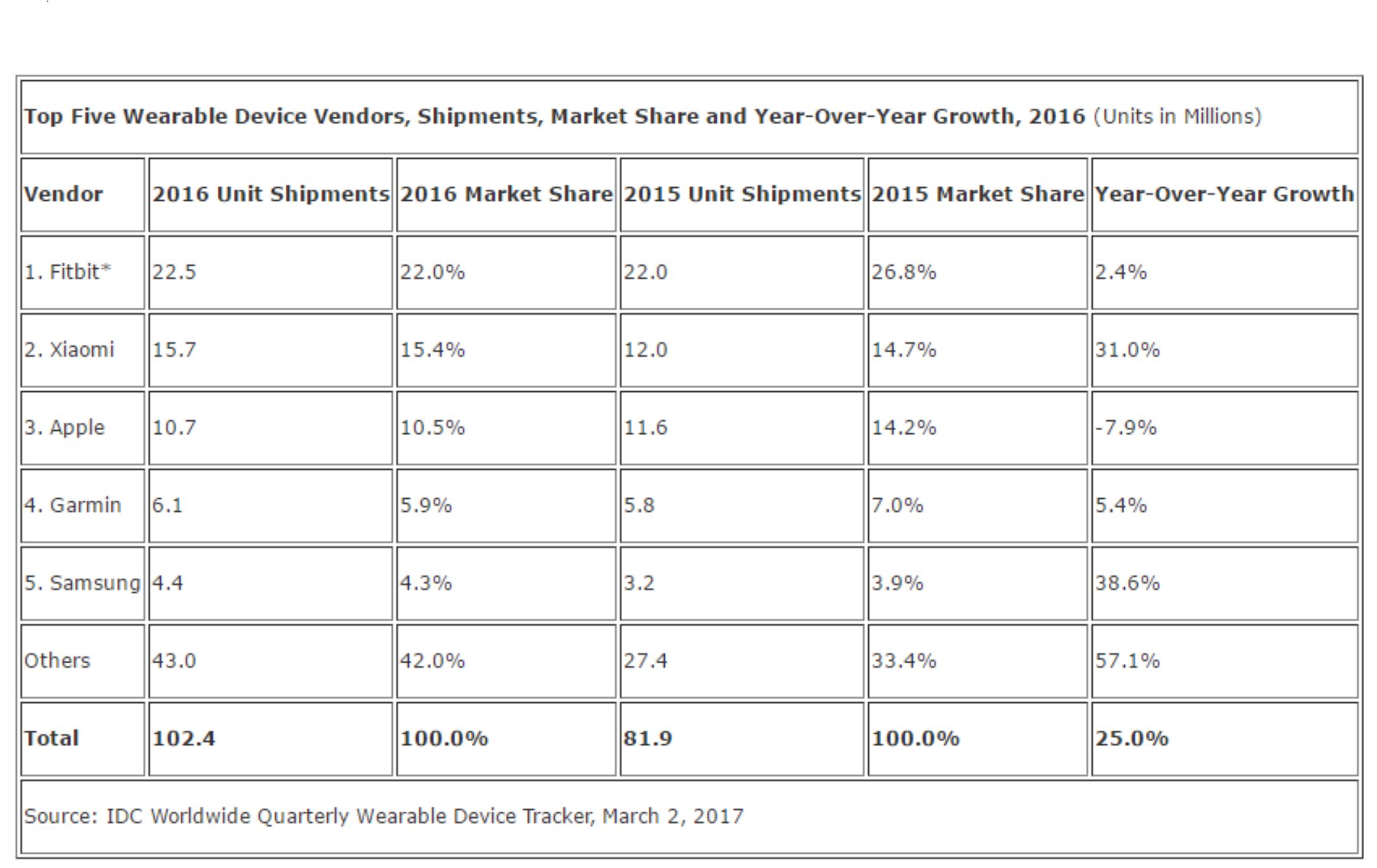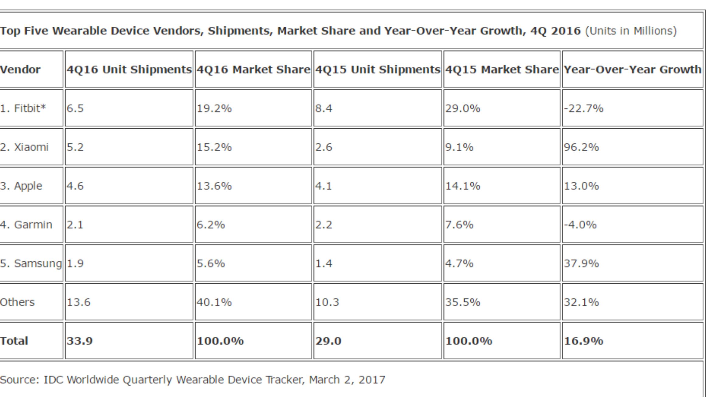 E interesant că Fitbit a scăzut cu 22% la vânzări față de aceeași perioadă a anului trecut, pe când Xiaomi a crescut cu aproape 100%. Apple a avut per total un an mai slab decât 2015, cu o scădere de aproape 8%.