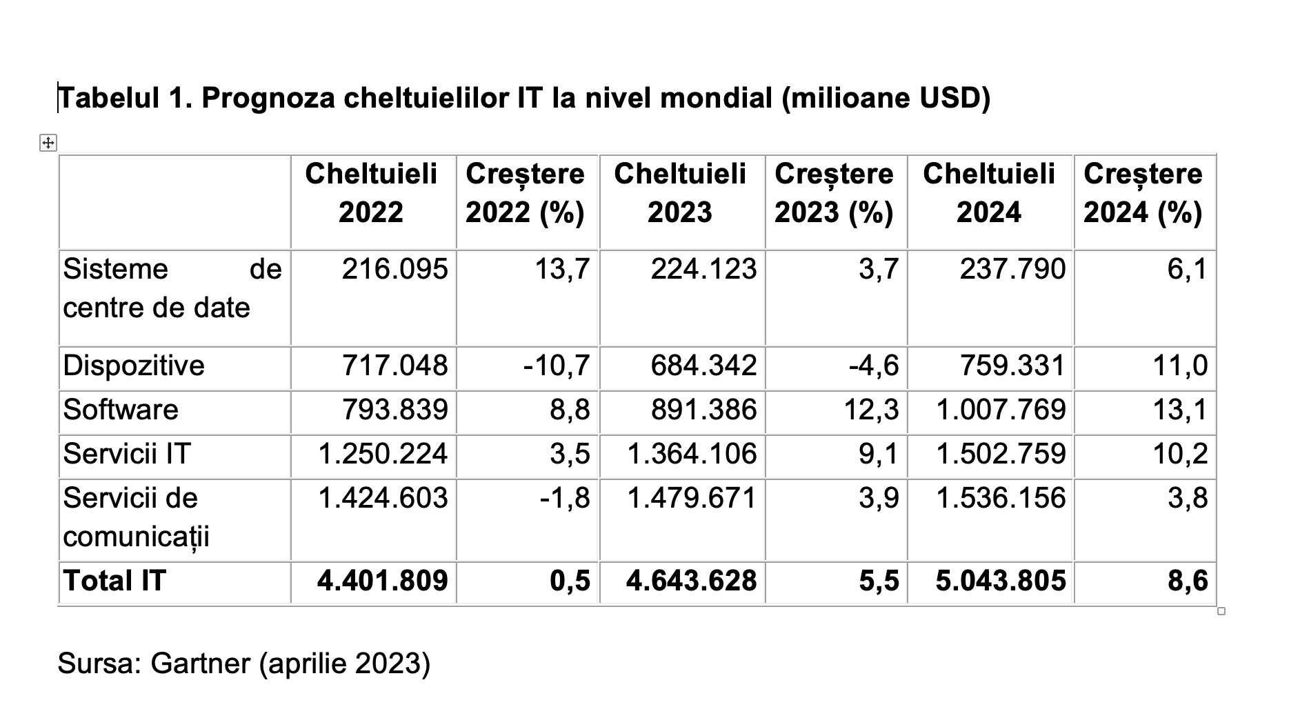 Segmentul de software va înregistra o creștere de două cifre în acest an, deoarece companiile își prioritizează cheltuielile pentru a obține avantaje competitive prin creșterea productivității, automatizări și alte inițiative de transformare bazate pe software. În schimb, segmentul dispozitivelor va scădea cu aproape 5% în 2023, deoarece consumatorii amână achizițiile de noi echipamente din cauza scăderii puterii de cumpărare și a lipsei de stimulente pentru cumpărare (vezi tabelul 1).