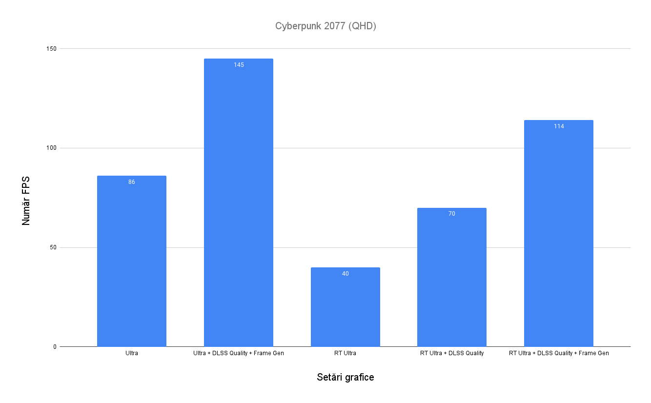 Am vrut să ce poate să ofere un asemenea laptop. În continuare o să las pe ecran grafice cu numărul de FPS-uri înregistrat în jocuri și programe. Pe scurt, RTX 4090 e foarte performant și poate bate un desktop cu o placă video RTX 2080, de exemplu.