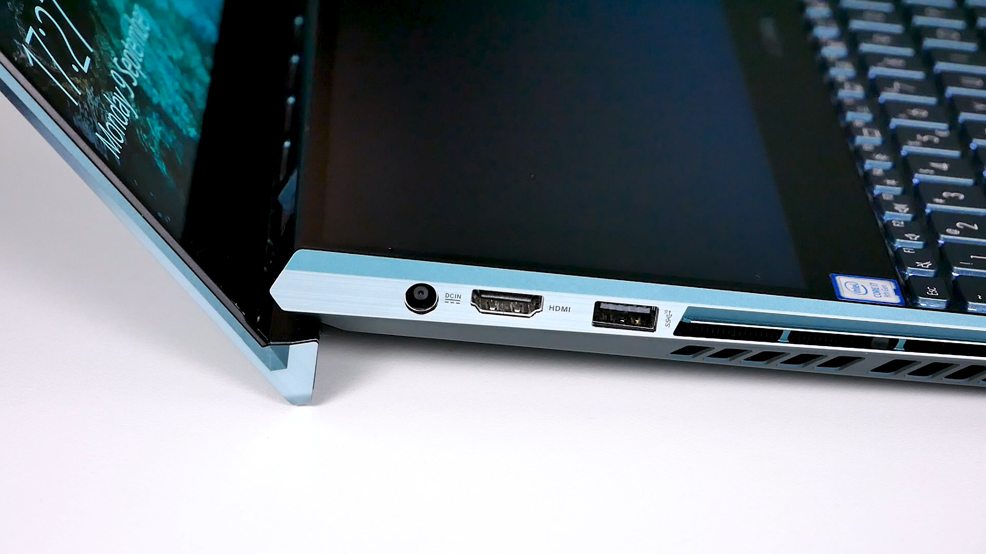 Arată ca un ultrabook premium, însă este mult mai greu decât te-ai aștepta. Acest laptop cu două ecrane cântărește 2,5 kilograme, iar dacă adaugi și încărcătorul te aproprii de 3 kilograme. ZenBook Pro Duo are două fante de aerisire pe lateral, a căror menire este să scoată aerul cald din interior, două porturi USB 3.0, un port USB-C Thunderbolt, mufă de căști și port HDMI. Din păcate, lipsește un cititor de carduri, ceea ce e ciudat având în vedere că laptopul este țintit către creatorii de conținut.