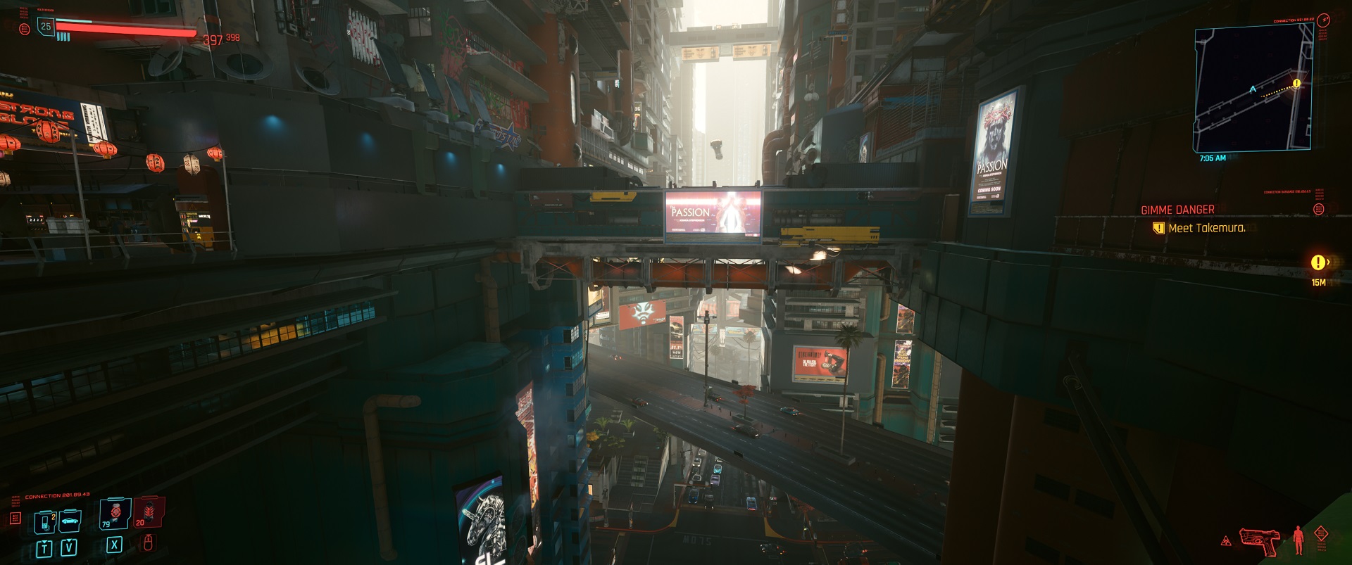 Pentru mine, imersiunea a fost stricată de unele bug-uri, însă și de unele momente scriptate. Prima dată când pășești prin oraș, vezi o metropolă vie cu mulți oameni, cu zgomote și aproape că simți și mirosurile de la tarabele cu mâncare. Asculți involuntar conversațiile celor de lângă tine (unele se transformă în misiuni) și vezi că e viață în lumea asta virtuală, apoi mai târziu treci prin același loc și vezi aceleași persoane vorbind aceleași lucruri, vezi câteodată aceleași conflice dintre poliție și diferitele găști în aceleași locații. Apoi îți dai seama că nu ești V în Night City, ci la mouse și tastatură în spatele unui ecran.