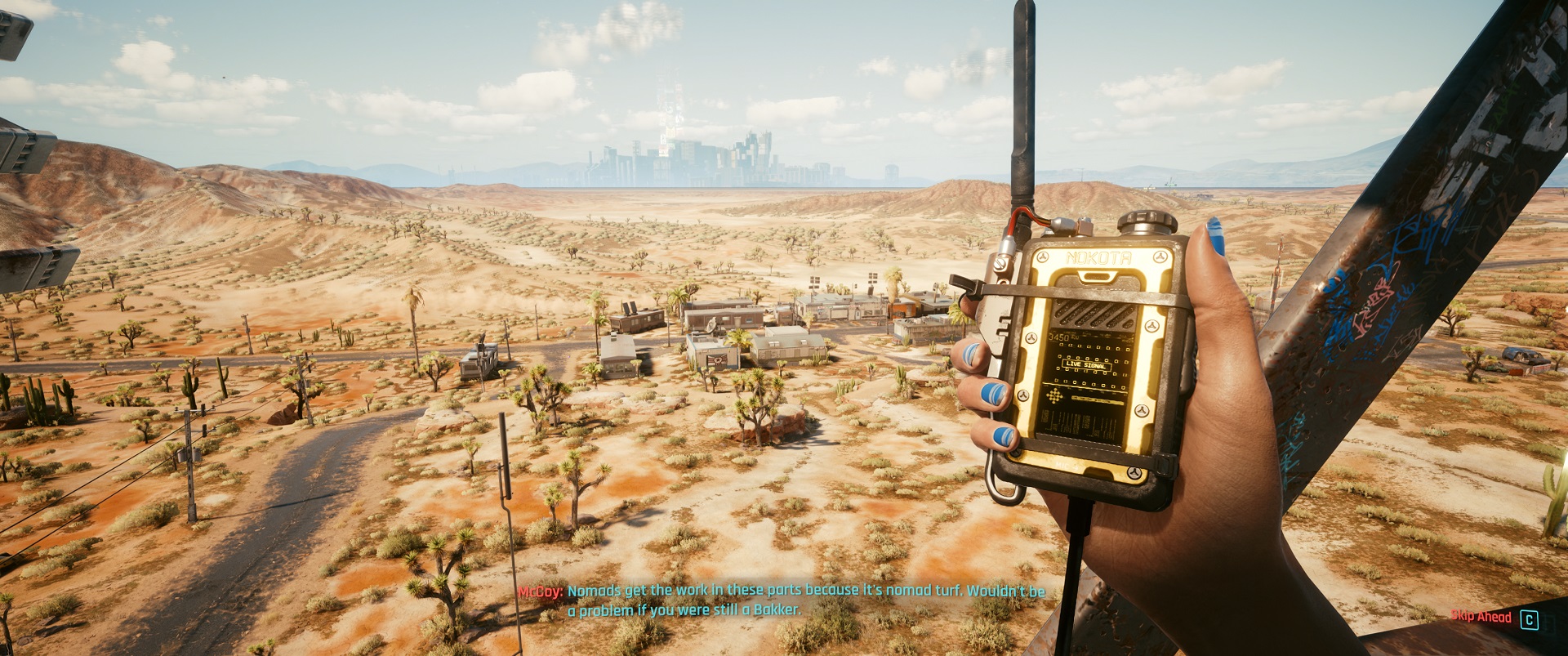 Orașul Night City este incredibil: grandios, uriaș, complex, frumos, curat și mizerabil. Este cea mai vie lume virtuală pe care am văzut-o. Fiecare scenă e plină cu obiecte, cu neoane, reclame, lumini și umbre. Este un spectacol la care trebuie să participi. Atmosfera este completată de aburi, ceață, ploaie și întuneric ce m-a dus înapoi în universul Bladerunner. De asemenea, orașul este unul destul de divers și ai zone mizerabile, altele aglomerate și frumoase, altele abandonate. Apoi mai este și badlands, o întindere mare de deșert presărată cu mici sate, așezări și o groapă uriașă de gunoi.