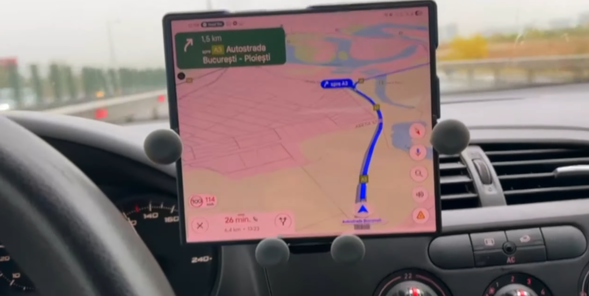 Un alt lucru de care am fost entuziasmat când am trecut la Fold e navigarea auto. Am o mașină mai veche cu un sistem multimedia care-și face treaba, dar ecranul mi se pare prea jos. Pentru Fold 7 am luat un phone holder capabil să-l țină deschis ca să am Waze și alte aplicații direct pe ecranul mare și în partea de sus, aproape de parbriz. Nu l-am folosit mult și nu e cel mai stabil, dar funcționează. Dacă mergi prin oraș și nu sunt drumuri prea accidentate atunci nu riști să-ți cadă telefonul de 2000 de euro pe jos.