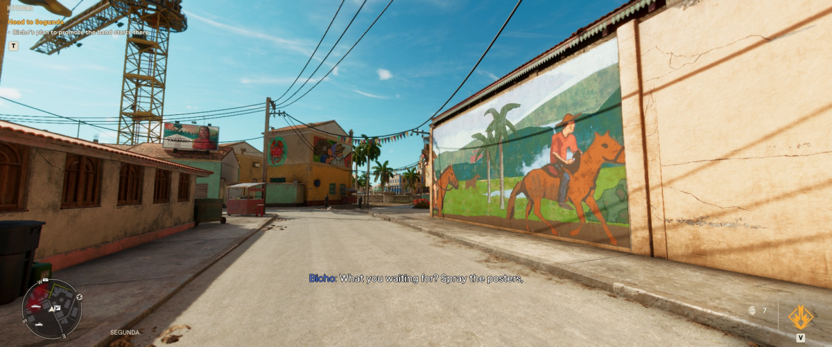 Dacă ai urmărit cât de cât trailerele sau materialele despre Far Cry 6 ai observat că jocul abundă de atmosferă latino și umor și exact asta am primit. Jocul este distractiv și amuzant prin personajele pe care ți le aduce în față, prin replicile lor, prin situațiile în care ești pus (am protejat un cocoș sălbatic în timp ce măcelărea soldații lui Anton Castillo și distrugea materiale de propagandă dintr-o bibliotecă), dar și prin armele pe care le folosești (tragi cu CD-uri cu Macarena). Au fost multe momente în care am râs cu voce tare, fie la replicile personajelor sau la situațiile în care am ajuns. Philly te pune să iei două obiecte dintr-o tabără, iar unul este o cască de la un costum de crocodil (de ce? Pentru că e amuzant). Altă dată pleci în salvarea unui membru al fostei echipe revoluționare din 67, iar când ajungi acolo vezi că este vorba de un tanc vai de capul lui numit Karlito.