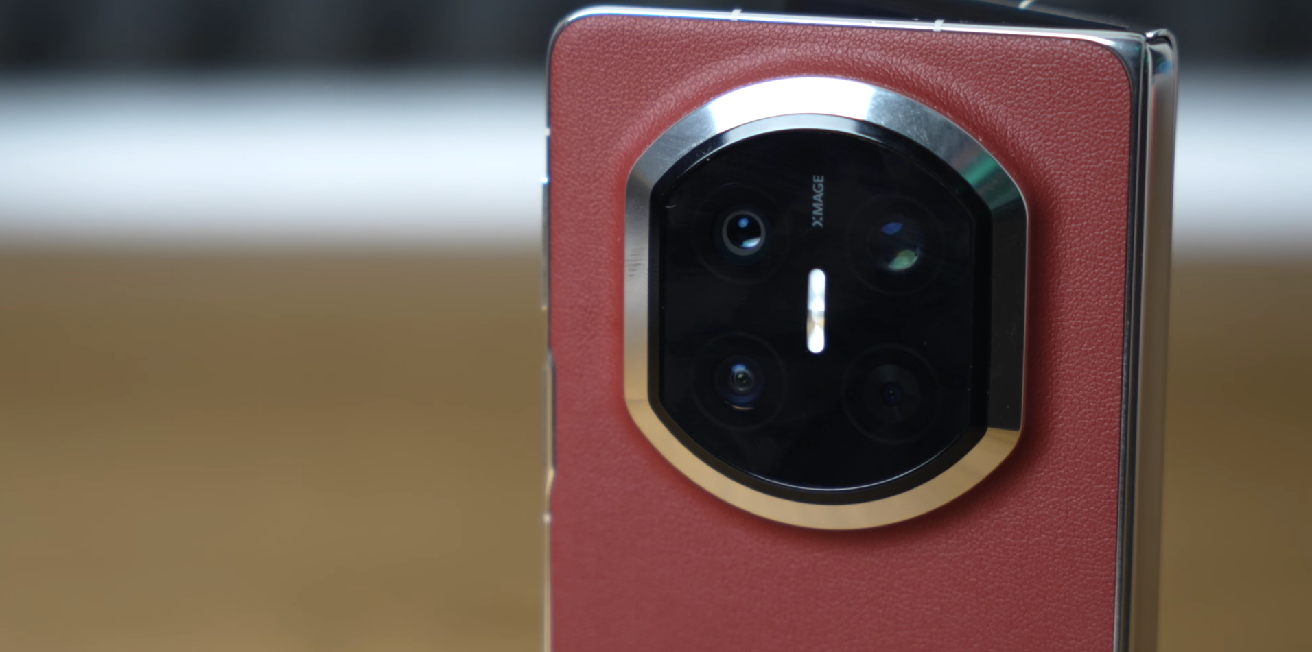 Mate X7 e un telefon familiar. Seamănă mult cu cel de anul trecut, diferența fiind la modulul camerei, acum mai gros, cu o formă hexagonală mai evidentă și parcă mai bine integrat pe spatele de piele artificială roșie. Dar e un modul de cameră gras ce nu permite stabilitate atunci când telefonul stă pe masă.