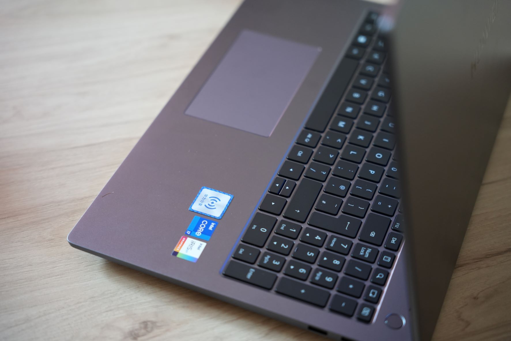 Când deschizi capacul, te întâmpină ecranul cu ale sale margini foarte subțiri, dar și tastatura mare, cu alfanumerică și track-pad-ul de dimensiuni bune. Logo-ul HUAWEI este poziționat și sub ecran.