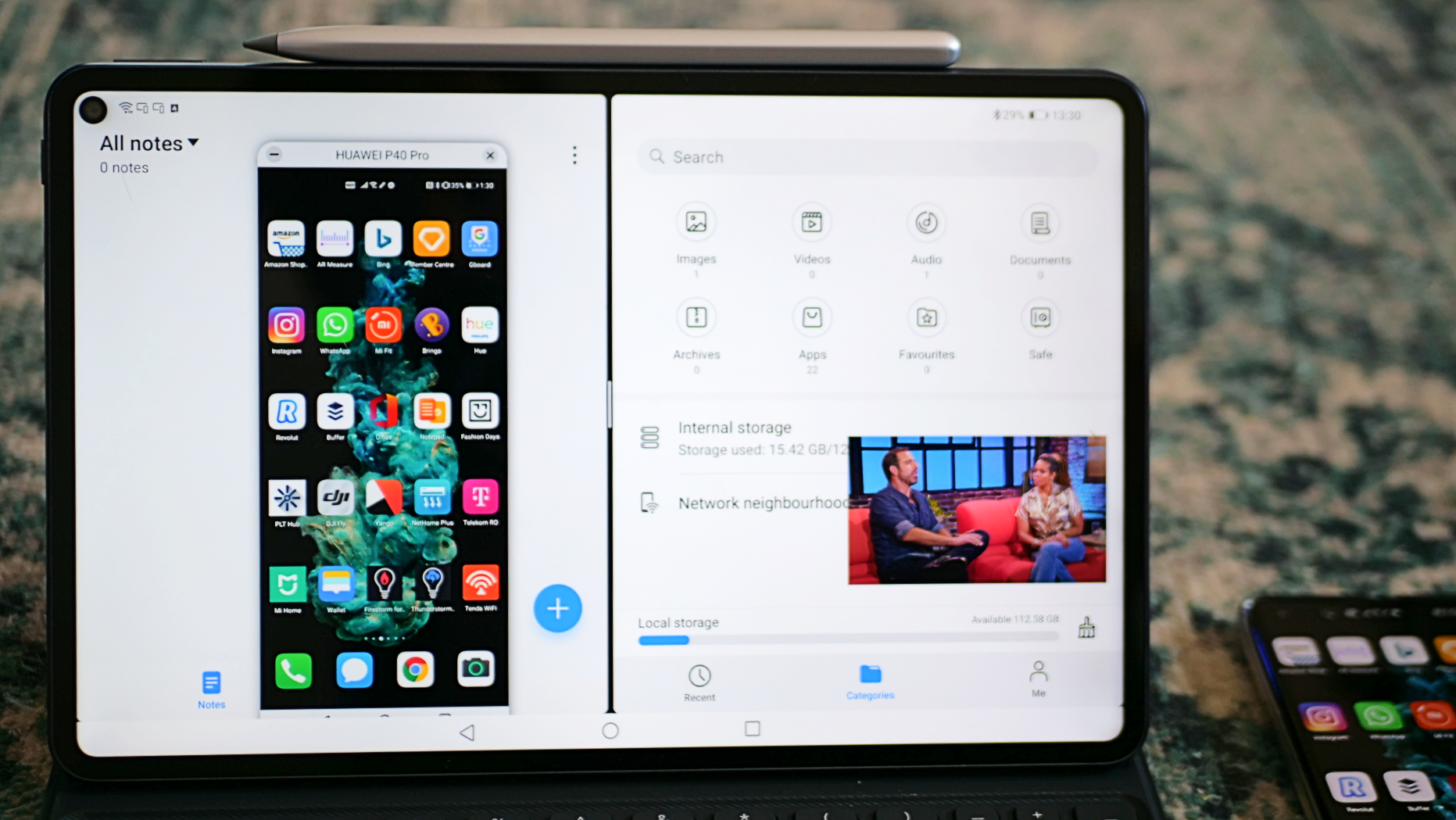 Trecând peste acest aspect, merită menționat că Huawei MatePad Pro vine cu o serie de funcții unice pe piața. În primul rând, funcția Multi Window îți permite să tragi conținut dintr-o aplicație în alta, deschise în paralel, cum ai face-o pe un desktop. Are chiar și un mod de desktop, cu un taskbar similar cu cel pe laptopurile cu Windows, care îți va permite să navighezi mai rapid cu un mouse și cu o tastatură și să redimensionezi ferestrele cum vrei tu. Mai mult, ai și funcția Huawei Share Multi Screen Collaboration care îți permite să îți legi smartphone-ul Huawei la tabletă și să-l controlezi de acolo, să transferi rapid fișiere, să vezi toate notificările în timp real, fără să butonezi două device-uri simultan. Tot prin Huawei Share poți lega tableta și la un laptop din seria MateBook pentru transfer rapid de fișiere. Poți avea pe ecran două aplicații de productivitate, o fereastră mică cu serialul preferat de pe Netflix și o fereastră în care vezi ce e pe telefon. E ceva ce nu mai vezi la nicio altă tabletă de pe piață și genul de funcție care ajută și mai mult la consolidarea ecosistemului hardware al Huawei.