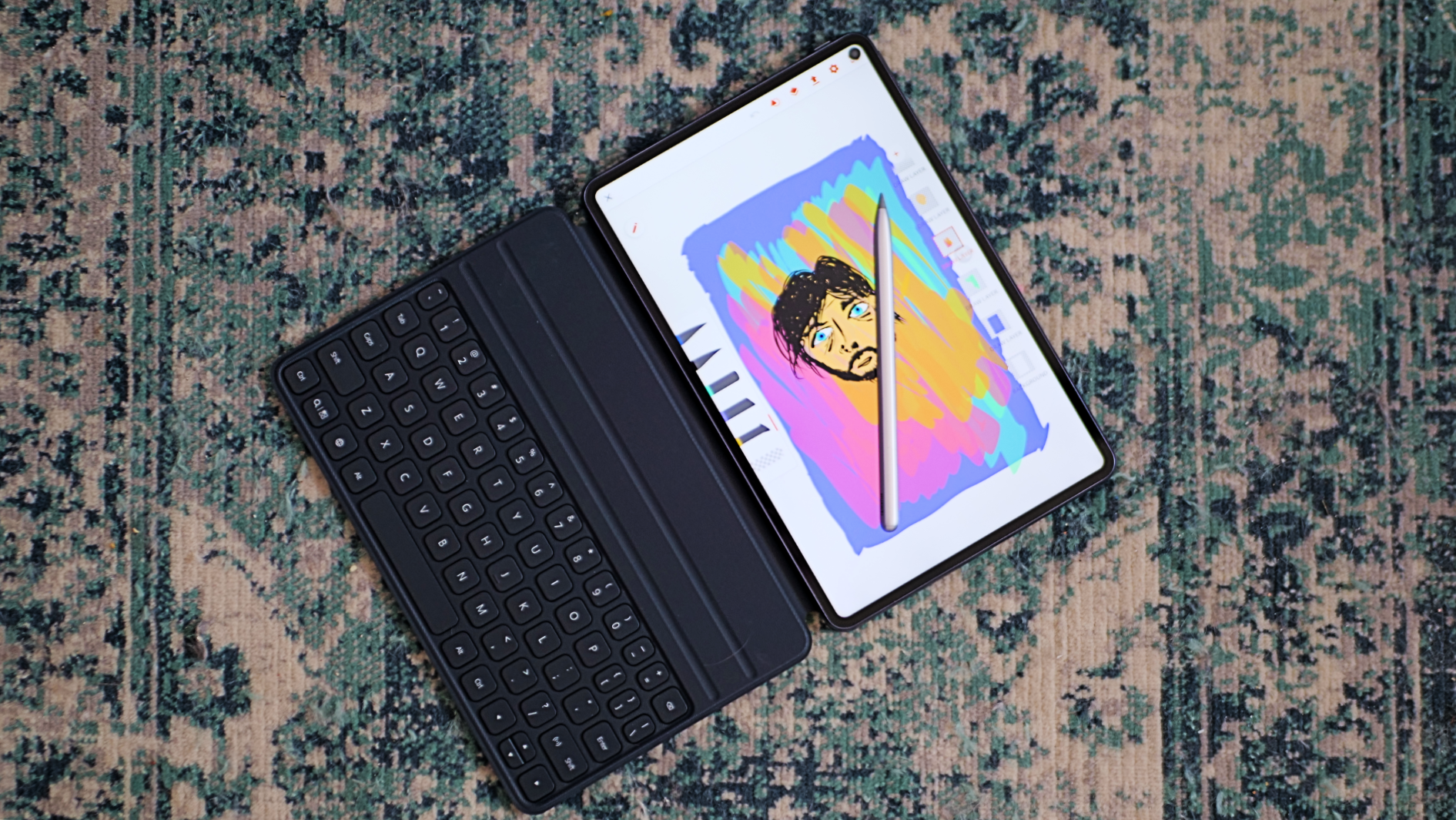 Apropo de ecosistemul hardware, să vorbim și despre stylusul M-Pen, dar și despre Smart KeyBoard, cele două accesorii pe care le-am avut la teste. M-Pen e un stylus minimalist, fără niciun fel de buton, doar cu un șanț pe mijlocul său care îl face să se atașeze perfect de marginea tabletei. Se conectează instant în momentul în care îl lipești de tabletă prima tabletă și tot la fel se încarcă. L-am încercat în Adobe Illustrator Draw și am avut parte de o experiență foarte fluidă, foarte similară cu folosirea unui pix cu gel pe o foaie de hârtie. M-Pen recunoaște până la 4096 de niveluri de presiune și poți fi artist cu el, sau poți lua notițe importante în întâlnirile de business. Vine în pachet cu câteva vârfuri de rezervă și i-am apreciat foarte mult designul simplu, dar ergonomic.