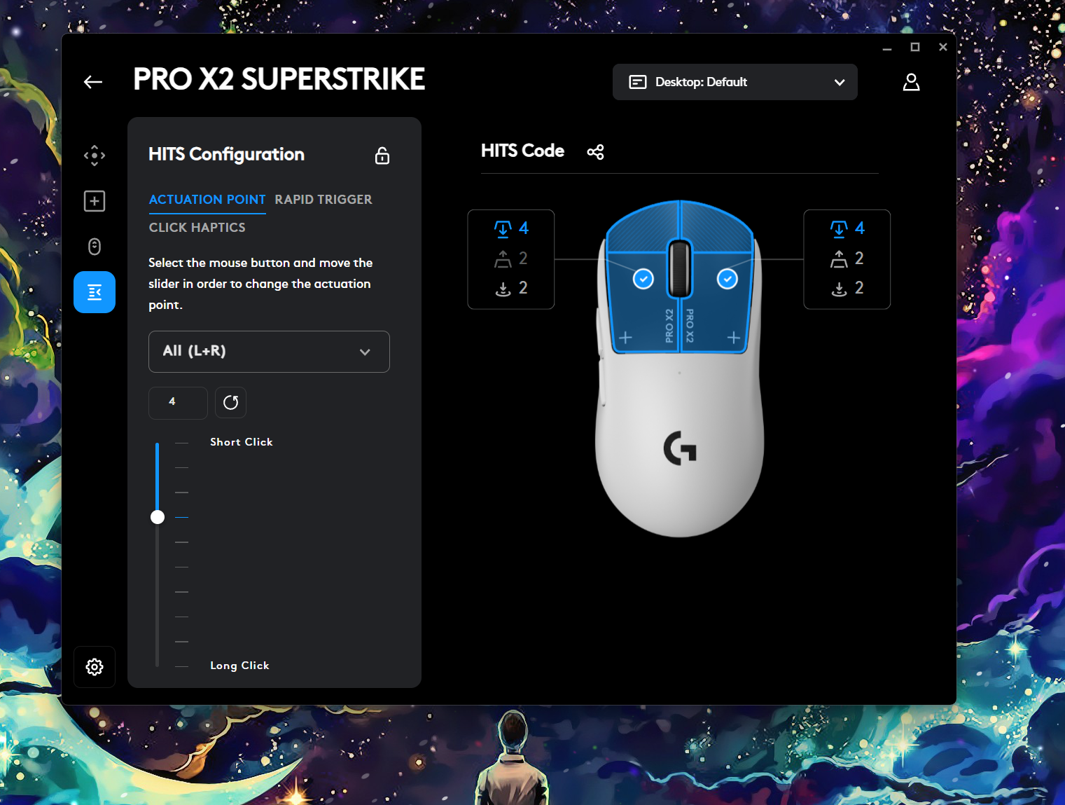 Dincolo de latență, HITS aduce ceva fără precedent pe piața de mouse-uri: puncte de actuare configurabile. Utilizatorul poate alege din 10 niveluri de actuare — practic, distanța la care apăsarea unui buton înregistrează un clic — și 5 puncte de reset rapid (rapid trigger). Aceasta înseamnă că poți seta mouse-ul să înregistreze un clic la cea mai mică atingere sau să necesite o apăsare deliberată, în funcție de stilul tău de joc.
