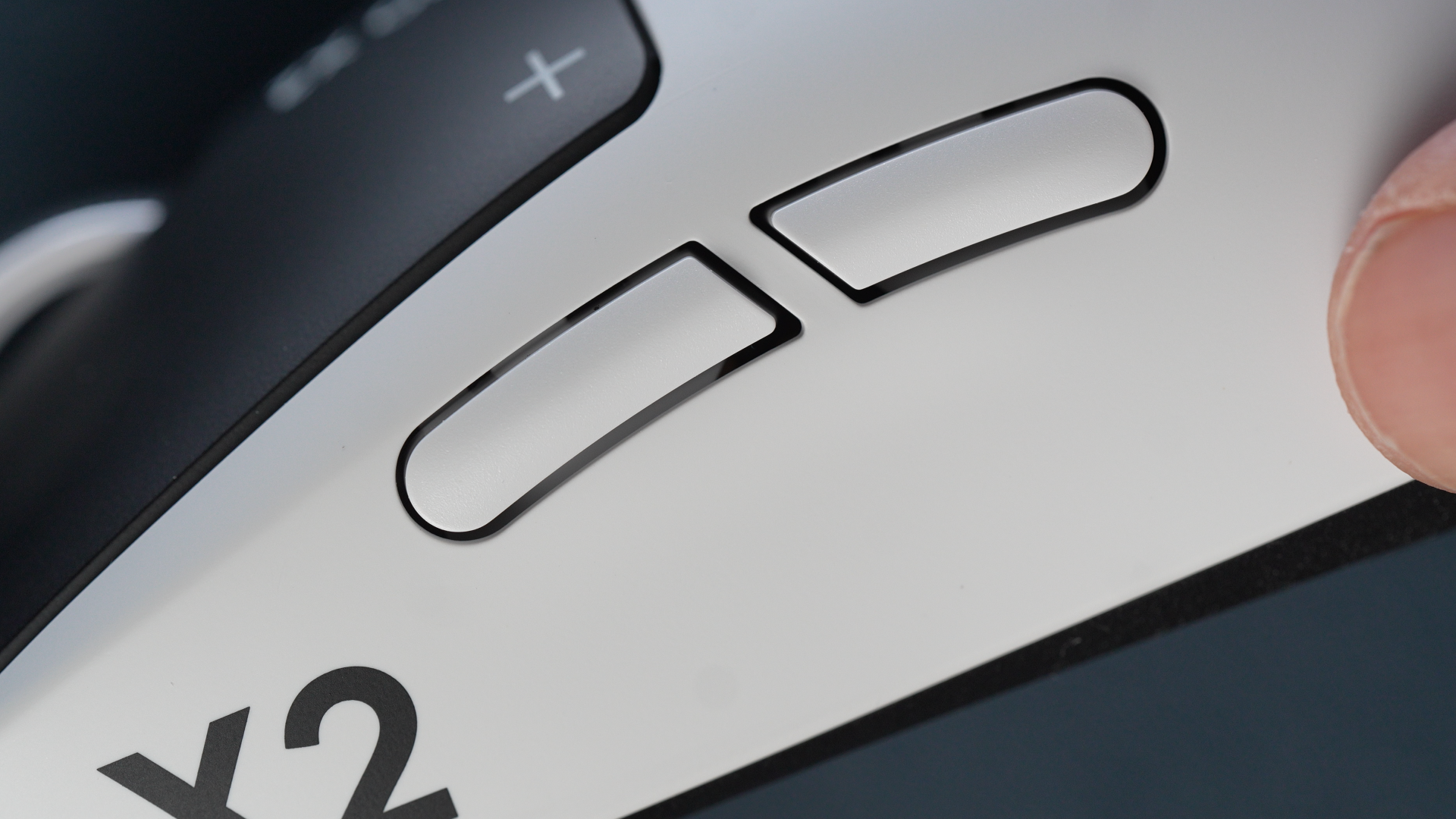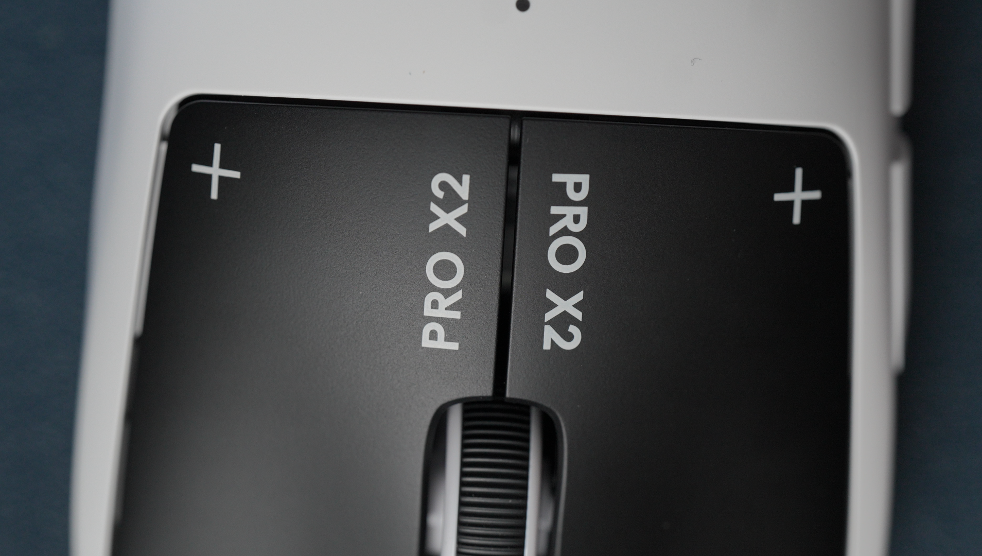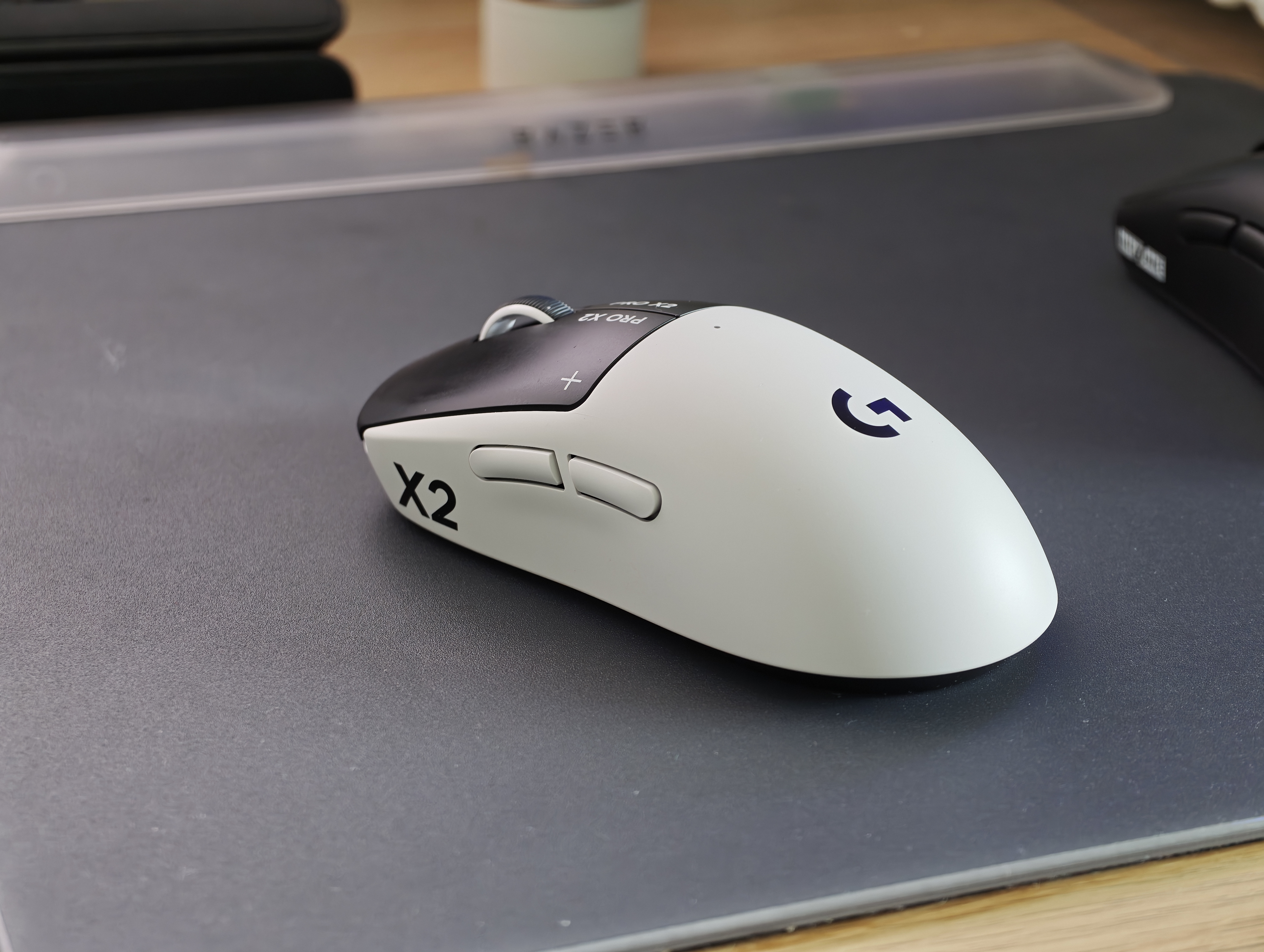 Îmi place estetica asta de alb-negru, dar nu pot să zic că mă omor după brandingul exagerat de pe mouse. Avem Pro X2 pe ambele butoane, X2 pe lateral, superstrike pe partea cealaltă. Logoul Logitech pe mijloc și așa mai departe.