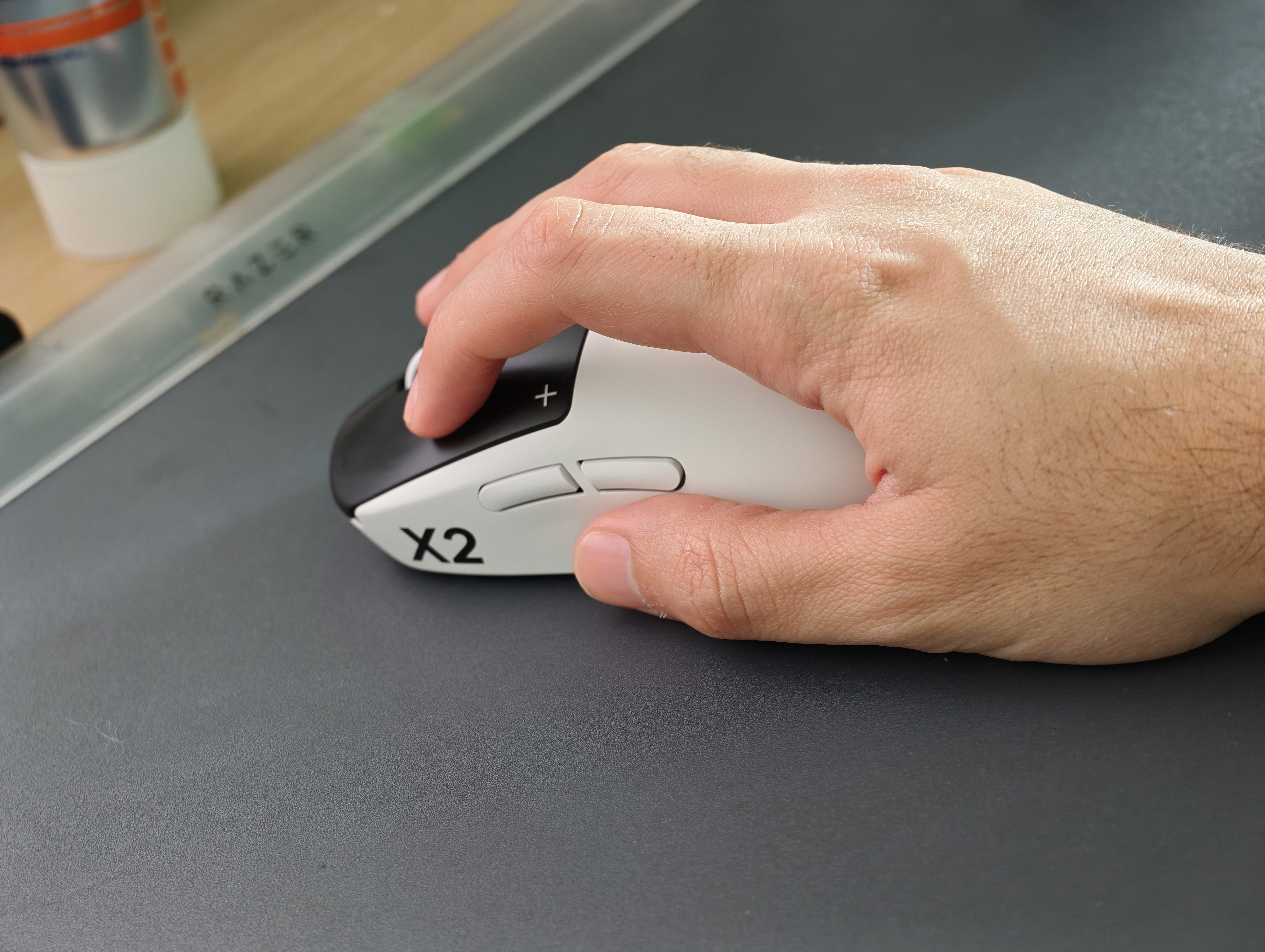 Carcasa este construită dintr-un plastic mat care rezistă bine la amprente și transpirație. Cele două butoane laterale de pe stânga sunt ușor de accesat fără a schimba priza, iar butonul de scroll oferă un feedback precis. Piciorușele din PTFE pur (fără aditivi) asigură un glisare fluidă și constantă pe orice suprafață.