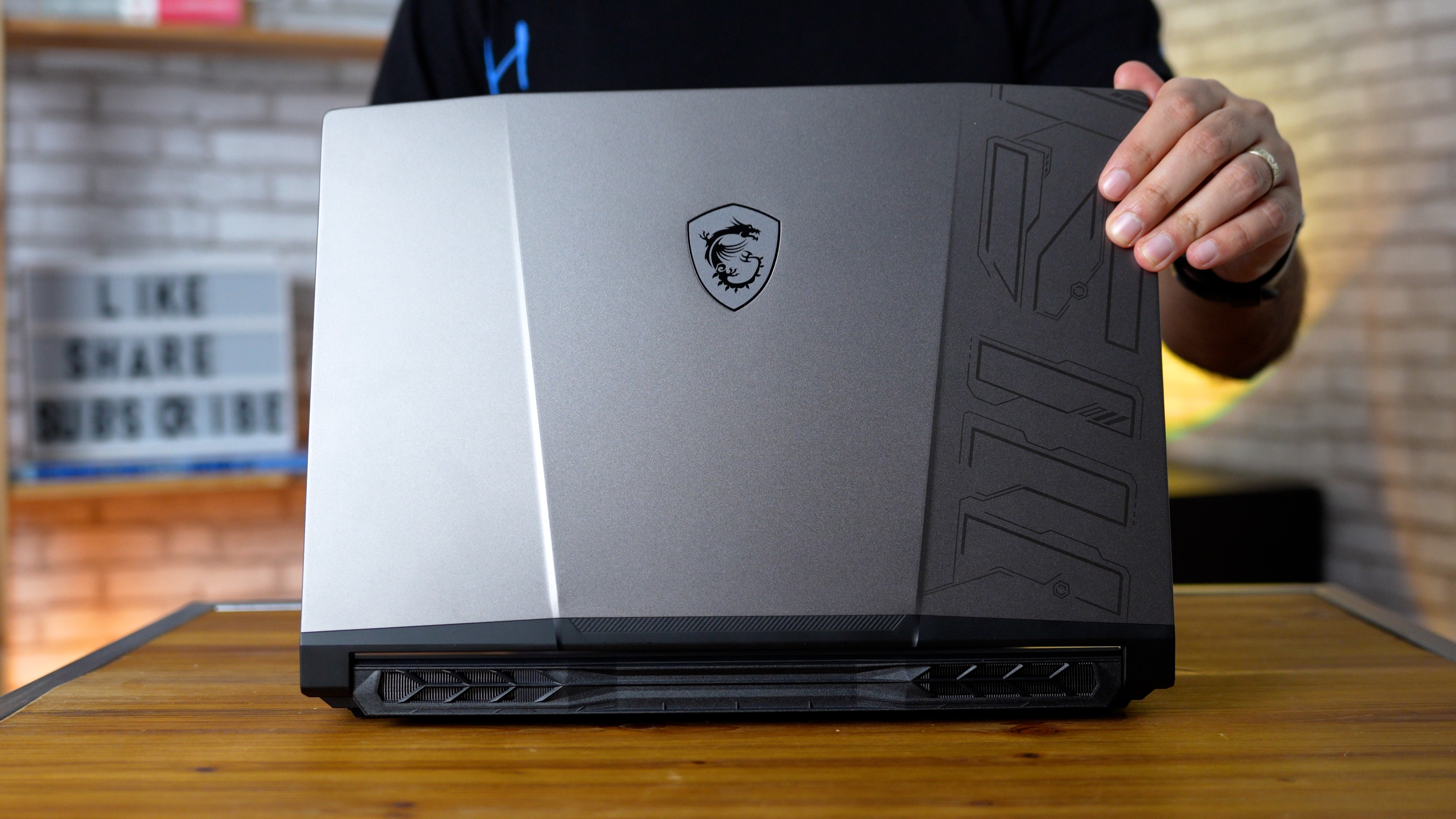 Înainte să trecem la grafice să trecem în revistă designul acestuia și să vorbim despre experiența de utilizare. Aspectul este unul foarte MSI, adică old-school gaming laptop. Dacă Lenovo merge pe un aspect minimalist, Asus se duce în modern flashy, MSI rămâne fidel look-ului de laptop de gaming clasic. Avem un capac gri cu logo-ul companiei în mijloc și un desen pe lateral.