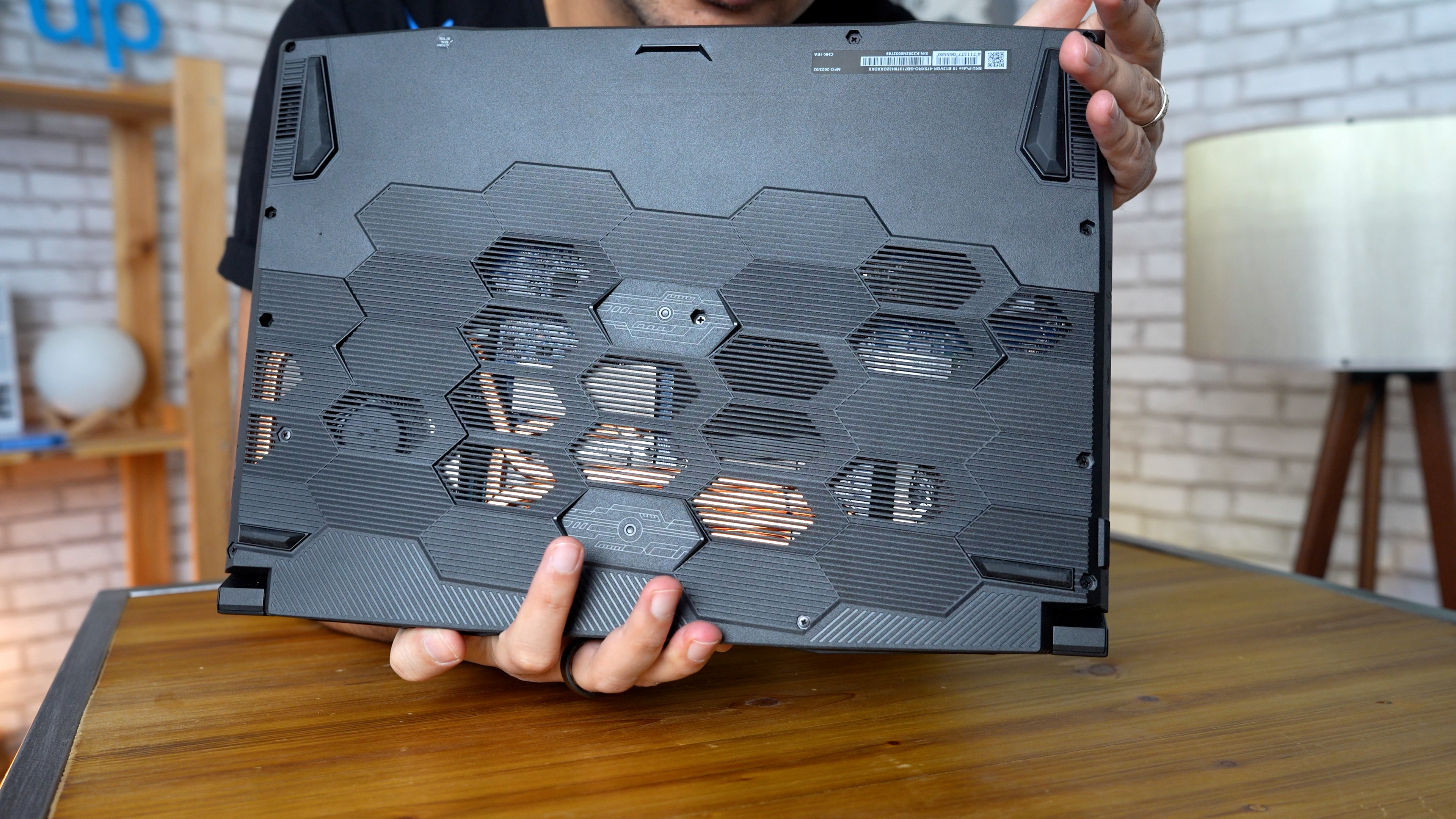 În schimb, ceea ce-mi place este că spatele este expus prin care se văd componentele și are această structură de fagure. Piciorușele din cauciuc sunt mari și solide. Tot pe spate avem și cele două difuzoare. În spate și în stânga avem fantele pentru expulzarea aerului cald. În dreapta nu avem ceea ce e bine deoarece nu-ți încălzește mâna când te joci, dacă ești dreptaci.
