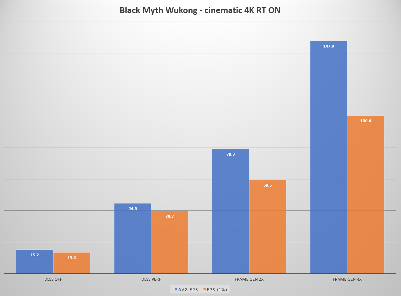 Black Myth Wukong este un joc mai demading și avem 43,3 FPS pe setări Cinematic fără DLSS, apoi cu DLSS Performance ajungem la 76,2 FPS și la 128,1 FPS cu frame gen, iar pe modul 4X ajungem la 223 de FPS.