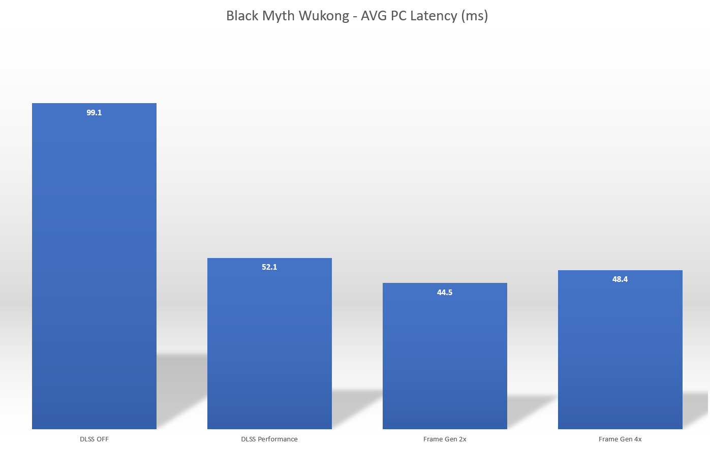 În Black Myth Wukong cea mai bună lanteță a PC-ului am văzut-o cu DLSS Performance și cu Frame Gen 2x cu 44,5 ms, apoi a crescut la 52 ms cu DLSS performance și a ajuns la 48,4 ms cu frame gen 4x. Fără DLSS am avut 99,1 ms.