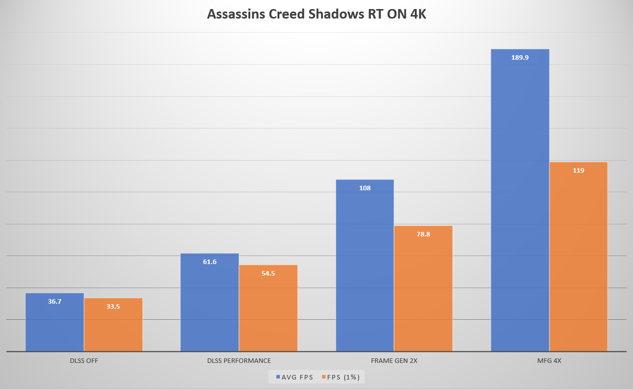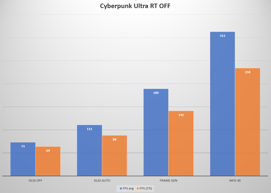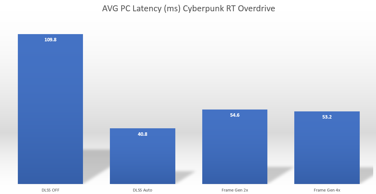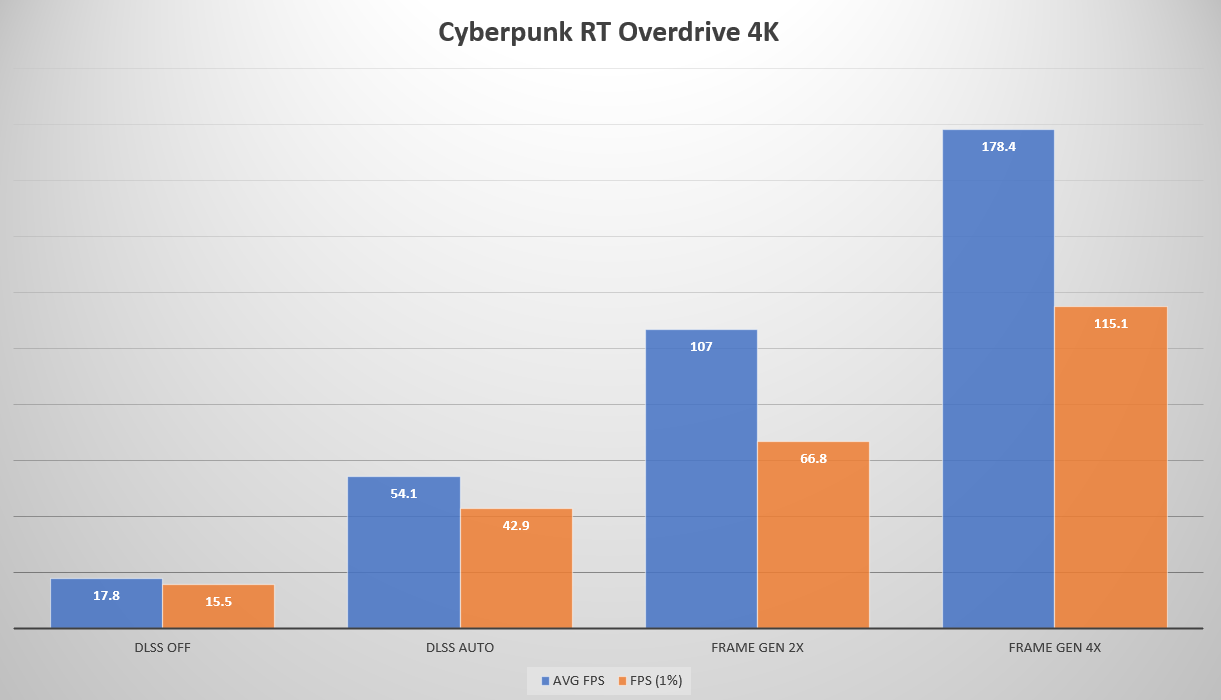 Cu presetul Path Tracing activat jocul devine greu de procesat pentru placă video și are 17,8 FPS fără DLSS, dar ray tracing cere DLSS și pe modul auto are 54,1 FPS, iar cu frame generation se dublează numărul la 107 FPS, iar cu frame gen 4x ajunge la 178,4 FPS.