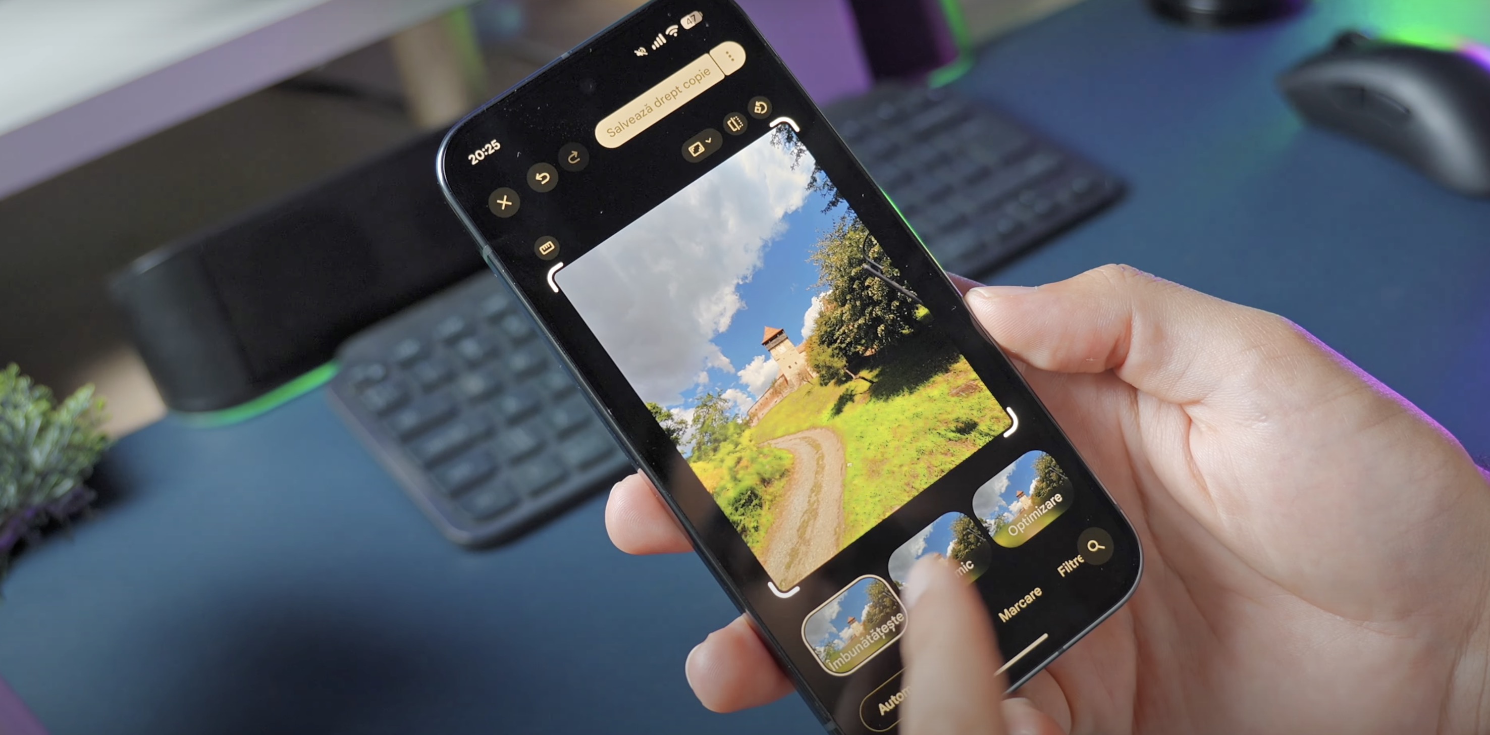 O altă funcție care mi-a plăcut a fost cea de încadrare automată și telefonul îmi dă alte variante de cum ar putea arăta imaginea, poate să genereze fundal ca să folosești imaginea și landscape de ex.