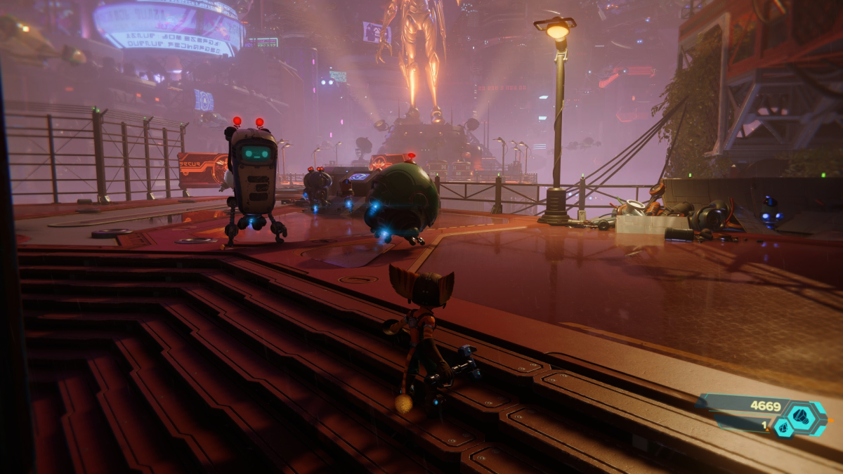Personajele sunt bine desenate și foarte detaliate, iar shaderele folosite pentru a reda blana lui Ratchet sau a lui Rivet sunt de calitate și complexe. Mediul înconjurător este și el la fel de detaliat și încă de la început în orașul Nefarious vedem mașini în mișcare în fundal, neoane, magazine, roboței al căror metal reflectă lumina neoanelor. Și peste toate acestea adaugi și ray tracing pentru un desert complet. Per total, aș spune că arată mai bine chiar decât filmul Ratchet and Clank din 2016, iar asta este impresionant având în vedere că jocul este randat în timp real.