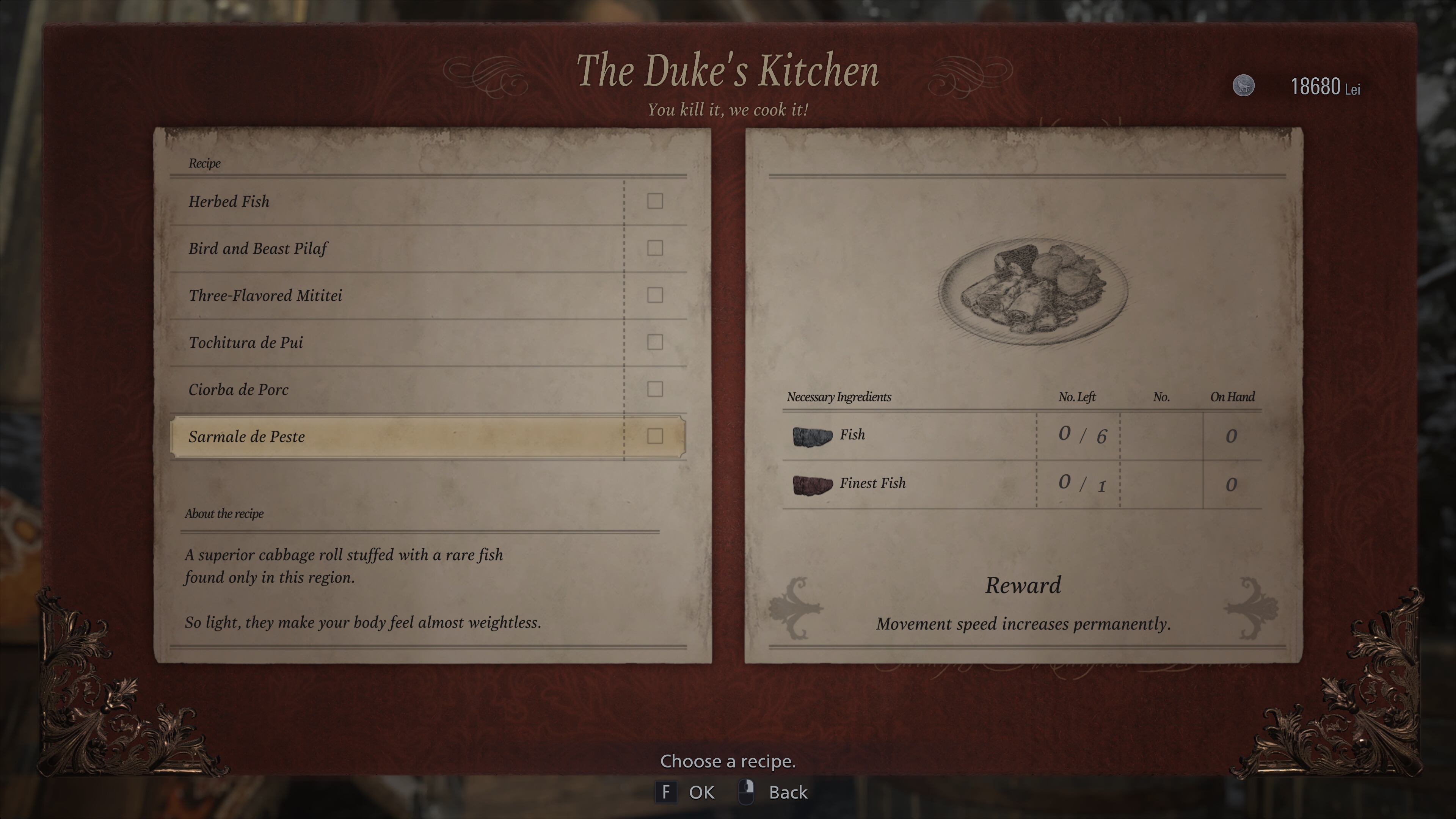 La un moment dat, ți se deblochează și opțiunea de a primi mâncare gătită (care e tot românească) și ai la dispoziție mititei (unii se fac din carne de pește…), sarmale sau tochitură, iar dacă aduci ingredientele necesare primești o porție care odată consumată îți aduce beneficii (sarmalele de pește îți dau viteză de deplasare mai mare).