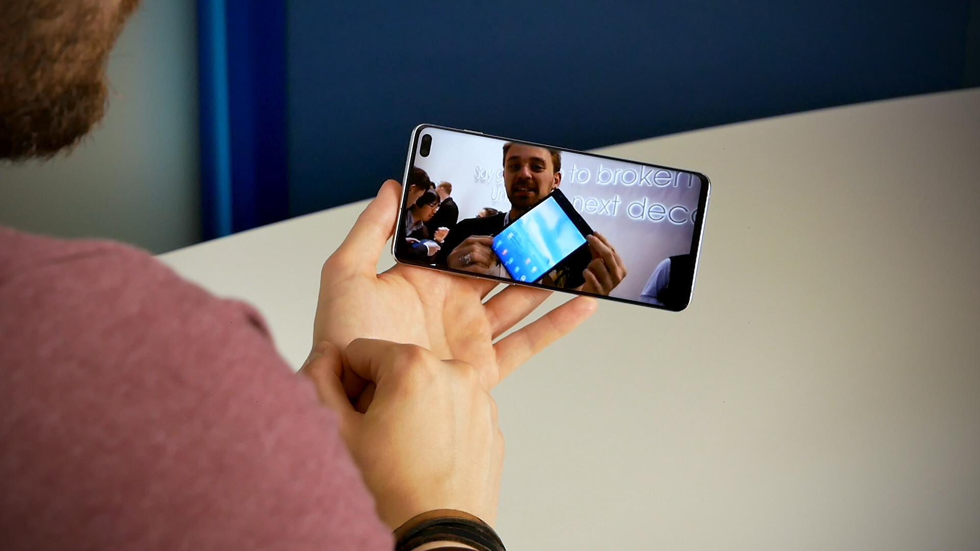 În partea din față avem display-ul de 6,4 inci și niște margini înguste. În părțile de sus și de jos marginea e infimă și aproape invizibilă, în timp ce pe margini s-a menținut designul Edge care coboară mult. Samsung denumește acest display unul Infinity-O. Aspectul e unul 19:9 și raportul ecran-șasiu e de 88,9%. În partea inferioară a ecranului e zona unde poți să atingi cu degetul pentru a debloca telefonul prin amprentă.